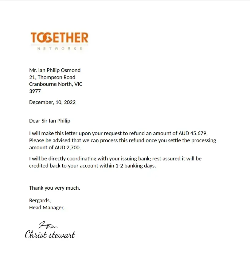 Sorry mr stewart read the added letter below from the boss to me.. I am not and able to pay the ransom you require.. It all started with a safe daters pass and with holding me to ransom and some fraud say I have to pay a$2750 to perhaps get my $ 46596 that was bullied out of me and promises of full money back.. This has happened 7 times it was my last...