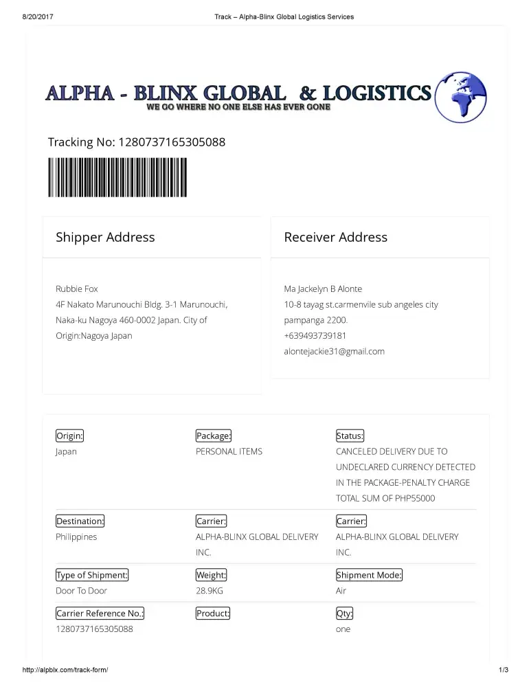 i got box from rubbie fox and ship to cargo name state above but they scan the box and they said that they scan money more than 11K dollars so they ask me about to pay due taxes cost its 18k php then after they scan they found out a money more than 11k dollar s in the box so they ask me to pay 35k php again for releasing my box for delivery then i payed...