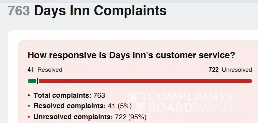 Our conclusion: After a detailed review, ComplaintsBoard finds Days Inn to be a trustworthy company. Although there's a 5% resolution rate for customer complaints, which deserves attention, Days Inn is known for their high standards and safety. If you're thinking about dealing with Days Inn, it's wise to check how they handle complaints.