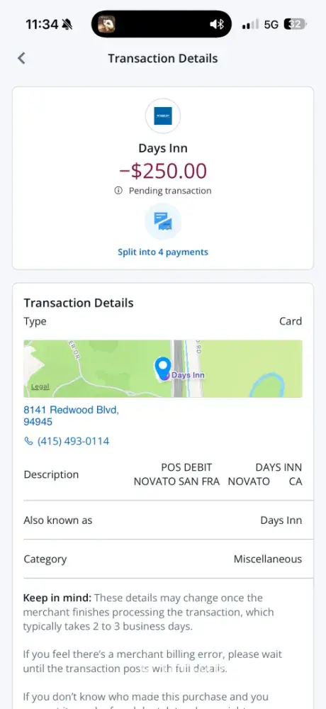 I was staying in the hotel in noveto california and the desk was very rude and room was gross so I left and told him I was leaving. Then I wake up to a $250 charge on my card. I was only in my room 5 mins. I believe he did this to make me mad after I said he was a [censored] and I left.