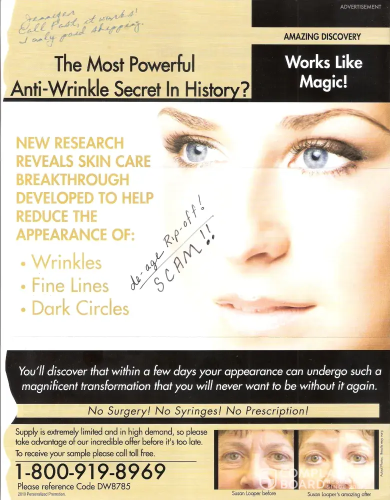 I'm so glad I found this site and read all the comments from those who had received the same mailing as I did. I was immediately skeptical due to the lack of return address on the envelope, unsigned note on the ad, and no product name given. I called the number on Memorial Day hoping they would be closed and the message identified the company as De-Age. I Googled the name and "800" number and found this site. I'm so thankful so many of you were willing to take the time to type out your complaints for the rest of us.
