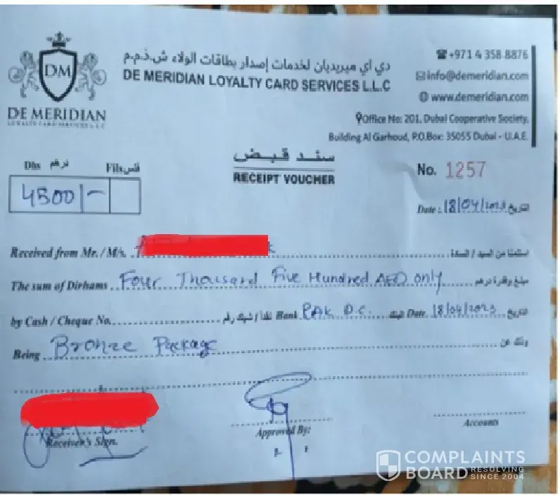 I paid 12,600 AED to De Meridian Loyalty Card Services LLC on 01-March-2025 at their office behind Le Meridien Hotel, near Airport Terminal 1, Dubai, expecting the promised loyalty card benefits: free hotel stays, travel discounts, and vouchers. What happened: Paid via debit card. Contacted them multiple times at reservations@demeridian.com and...