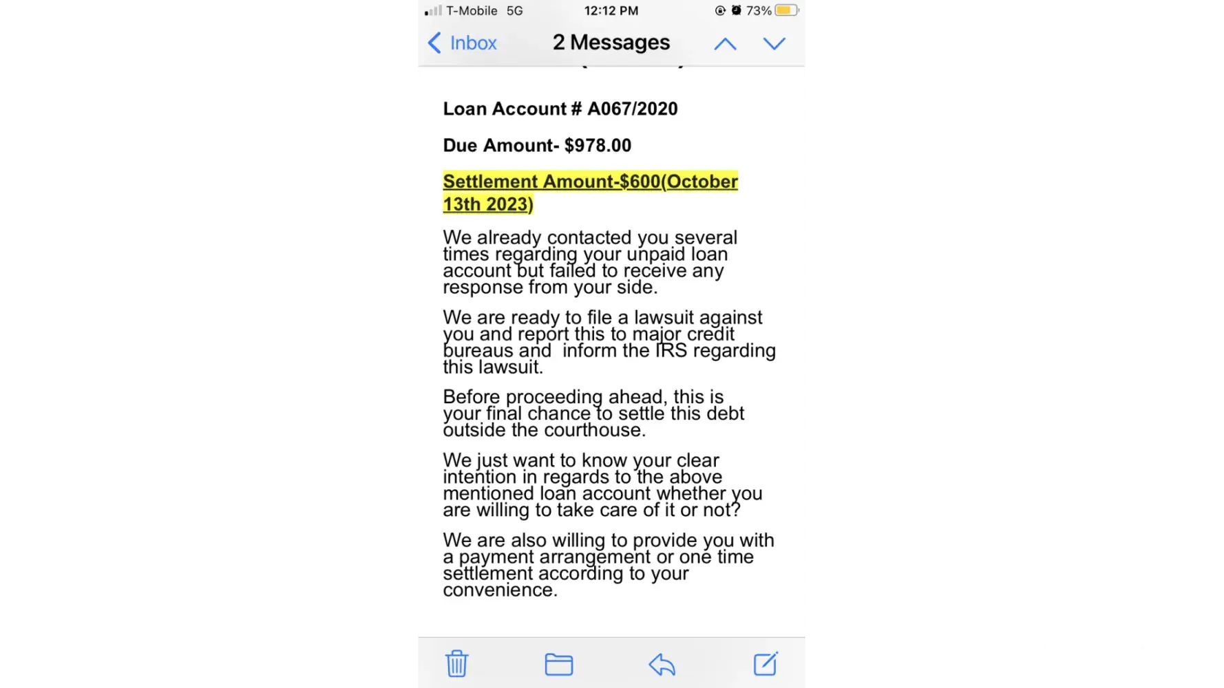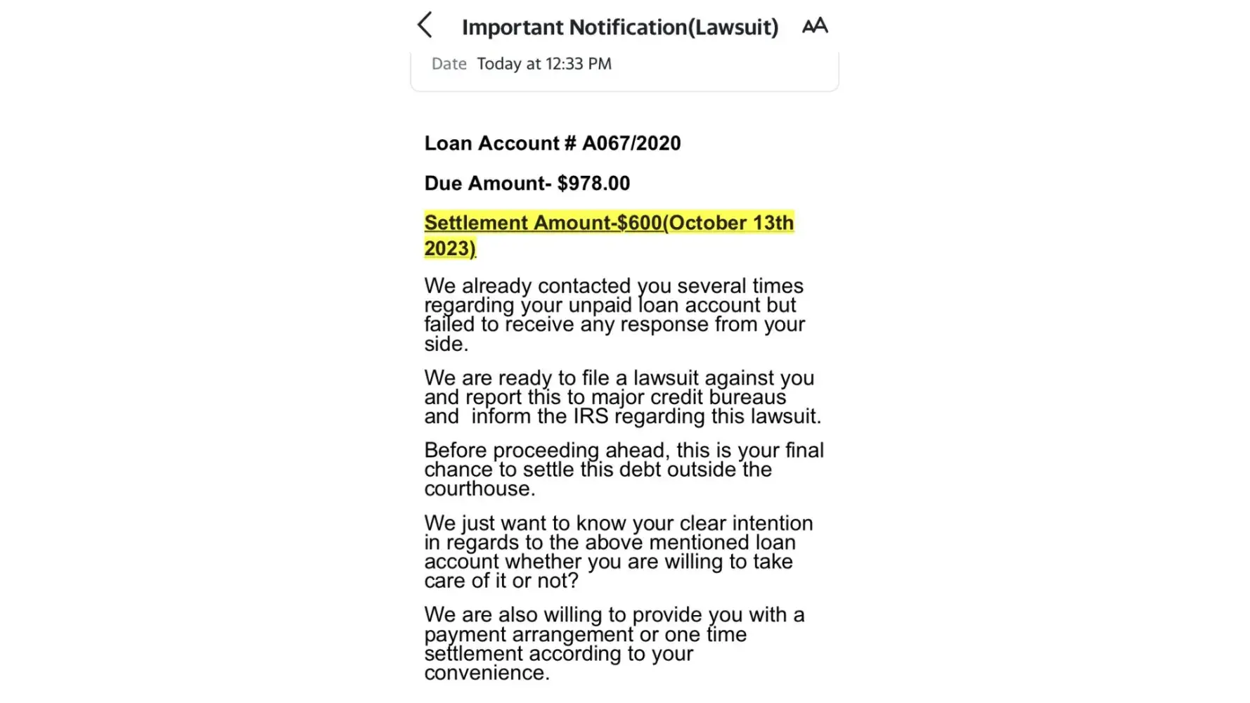 We are ready to file a lawsuit against you and report this to major credit bureaus and inform the IRS regarding this lawsuit.