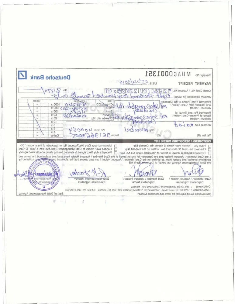 I am holding Deutsch bank credit, i dropped cheque on drop box and it is returned. This happened last time also and they have arranged a representative last time for collect the cash. Today is the last day for the payment.