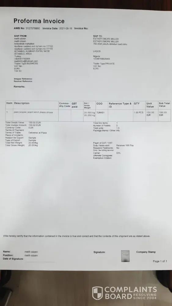 On the 17th of August 2021, a package with tracking ID [protected] to Esther Miller containing clothes, shoes, and accessories arrived in Nigeria through DHL Express service from Istanbul, Turkey. As was explained, the package was held for 2-3 days by the Nigerian Customs for the duty evaluation to be done. The value of the package was duly noted on the pro forma invoice provided by the DHL agent in Turkey which is attached to this message, yet the duty charge came back at 285,000 nairas (approx $700), a ridiculous amount by all standards, considering the invoice states the value of the package at €150, an invoice provided by DHL Istanbul.