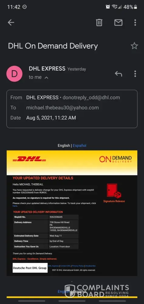 I would never choose DHL in the future. Federal express and UPS will contact the driver directly and make sure that adjustments are made on the fly. I can't believe this company, DHL, does not follow the same policy. In this day and age when customer service is everything.