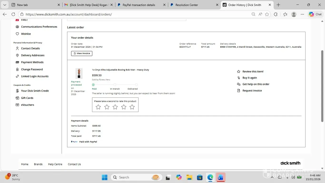 Annual subscription on 25/1/2026 of $341 .19 via Paypal transaction has been referred to NAB fraud department we are waiting for a response from Dick Smiths resolution department before presiding further