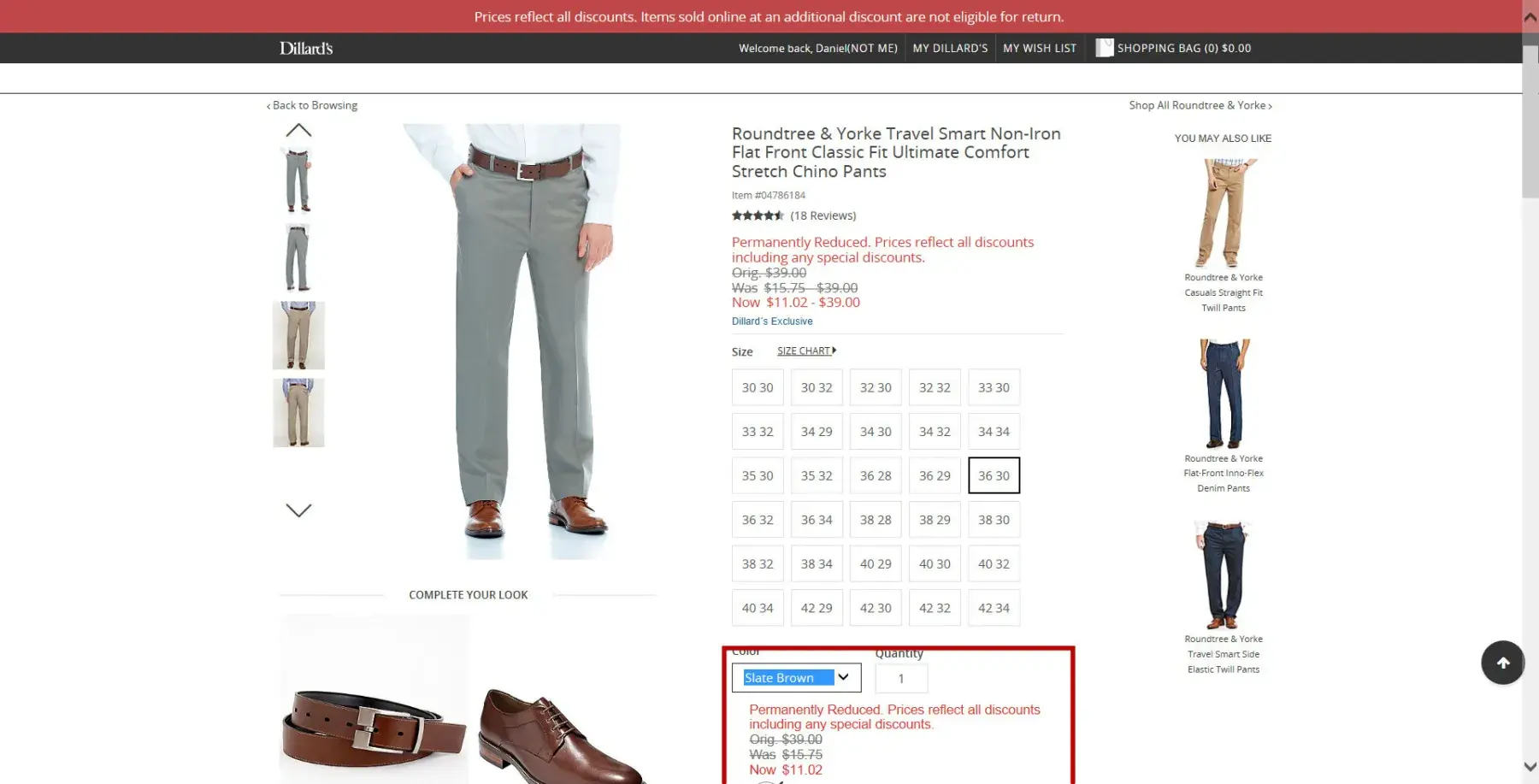 During the week of june 25, 2017, I purchased on-line 7 pairs of roundtree and yorke travel smart non-iron flat front classic fit ultimate comfort stretch chino pants. colors, item #s, and skus were as follows (see order [protected]):