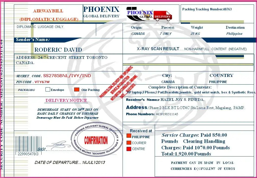 *Please Kindly Send The Money As Soon As Possible, So That Your Package Will Be release By The Custom And We Will Proceed To Deliver To Your Postal Address Philippines.