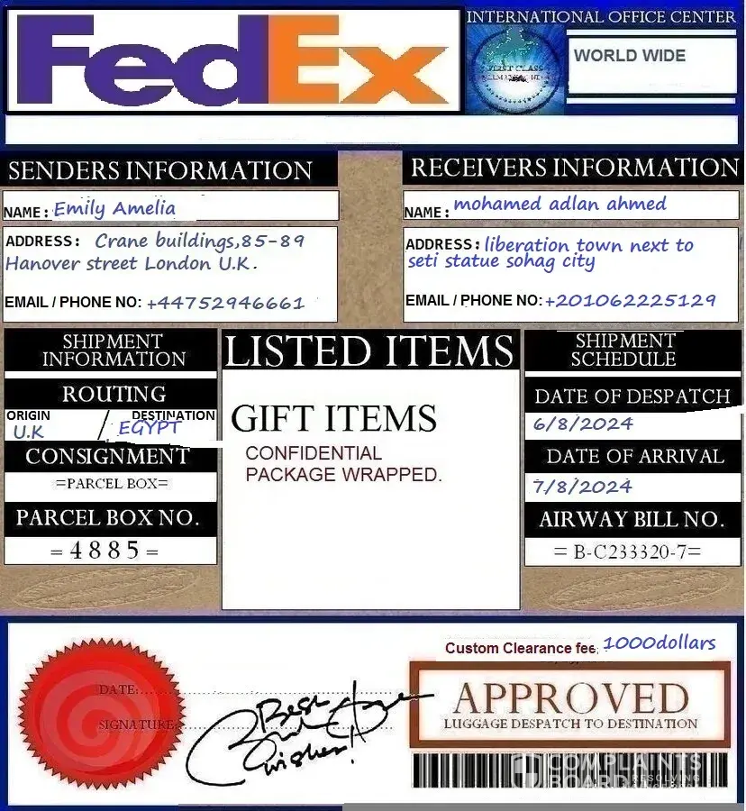 على Ø§ØØ¯Ù‰ النساء قالت انها تعمل طبيبه Ùˆ انها ارمله لرجل ØµØ§ØØ¨ عقارات وشركات كبيره وانها ØªØ±ÙØ¹ قضيه على تم زوجها لانه يريد الاستيلاء على الميراث وانها تريد ان ادعو الله لها ان تكسب القضيه من عم زوجها ولقد تم انها كسبت القضيه وبعد ذلك قالت لى انها سو٠ترسل لى ØÙ‚يبه Ùيها هدايا تليÙون ايÙون ولاب توب Ùˆ ساعه رولكس وملابس ÙˆØ§ØØ°ÙŠÙ‡ ومجوهوات وعطور Ùˆ 100 ال٠دولار وارسلت لى الايصال بتاع شركه الشØÙ† وقالت لى ان شركه الشØÙ† لها 1000 دولار أمريكي Ùˆ ÙÙ‰ Ø§Ù„ØµØ¨Ø§Ø Ø§ØªØµÙ„ عليا Ø§ØØ¯Ù‡Ù… يقول لى انه يريد 25000 جنيه مصري مقابل مصاري٠الشخن وكنت قبلها بالليل ØºØ±ÙØª ان الموضوع Ø§ØØªÙŠØ§Ù„ من النت Ùلم ارسل له شئ قال لى ارسلها على Ù…ØÙظه ÙوداÙون