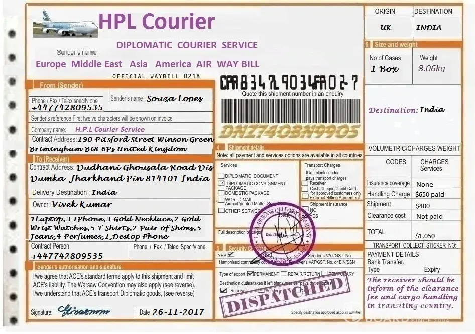 Thank you for all the information you was able to get for me, I just want to let you know that I have sent those items including the money through SECURITY SHIPMENT DE DELIVERY SERVICES, I am too busy arranging documents and tools, you know by 03 am in the morning tomorrow I will be working inside the engine room of the ship, and I will be very busy, I will call you once I am less busy, I love you so much, the Courier company promise to deliver to you on Monday, it is home delivery, their Diplomat/Agent will deliver to your address.