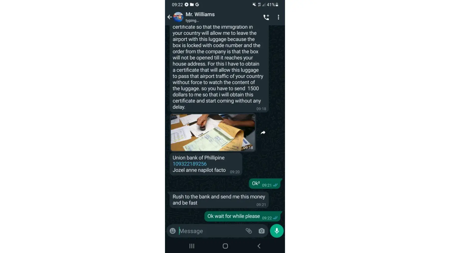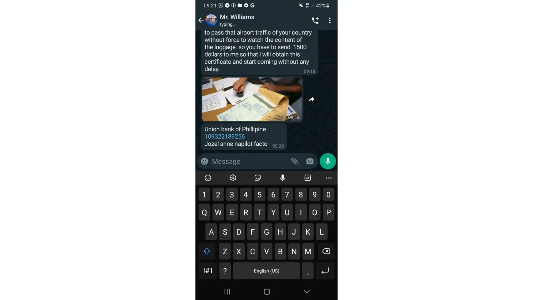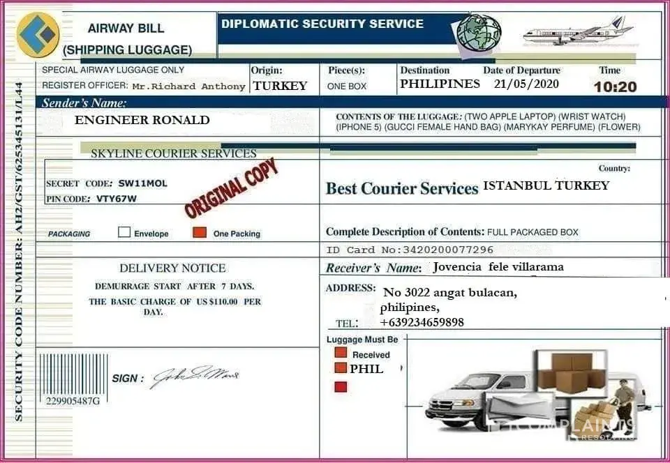By the 3rd weeks, he said he'd sent a luggage of gifts for me with iPhone 10, iPad, PS4, gold chains & 8500 pounds. I was later told that the cash was for me to pay for the tax clearance in Malaysia which is odd. Cos' my place of residence isn't even in Malaysia. I was contacted by this dubious Malaysia number which informed me to pay $3000 for clearance via bank transfer. Most courier services do not do bank transfers via personal accounts. So this definitely raised alarm.