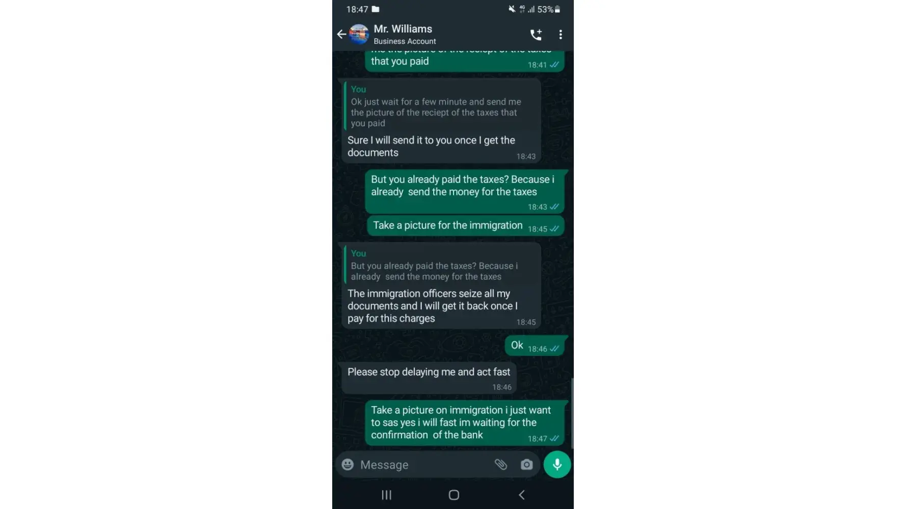 I just pay the money.after he say now give other money RM-5000.00, but I do'nt give the money.my girlfriend say you pay the money and recive the persel. but I do't have money. I say my girlfriend if you can pay money do it.she say now she stay scotland.so she no give money.I just call agent ok you return to persel london.
