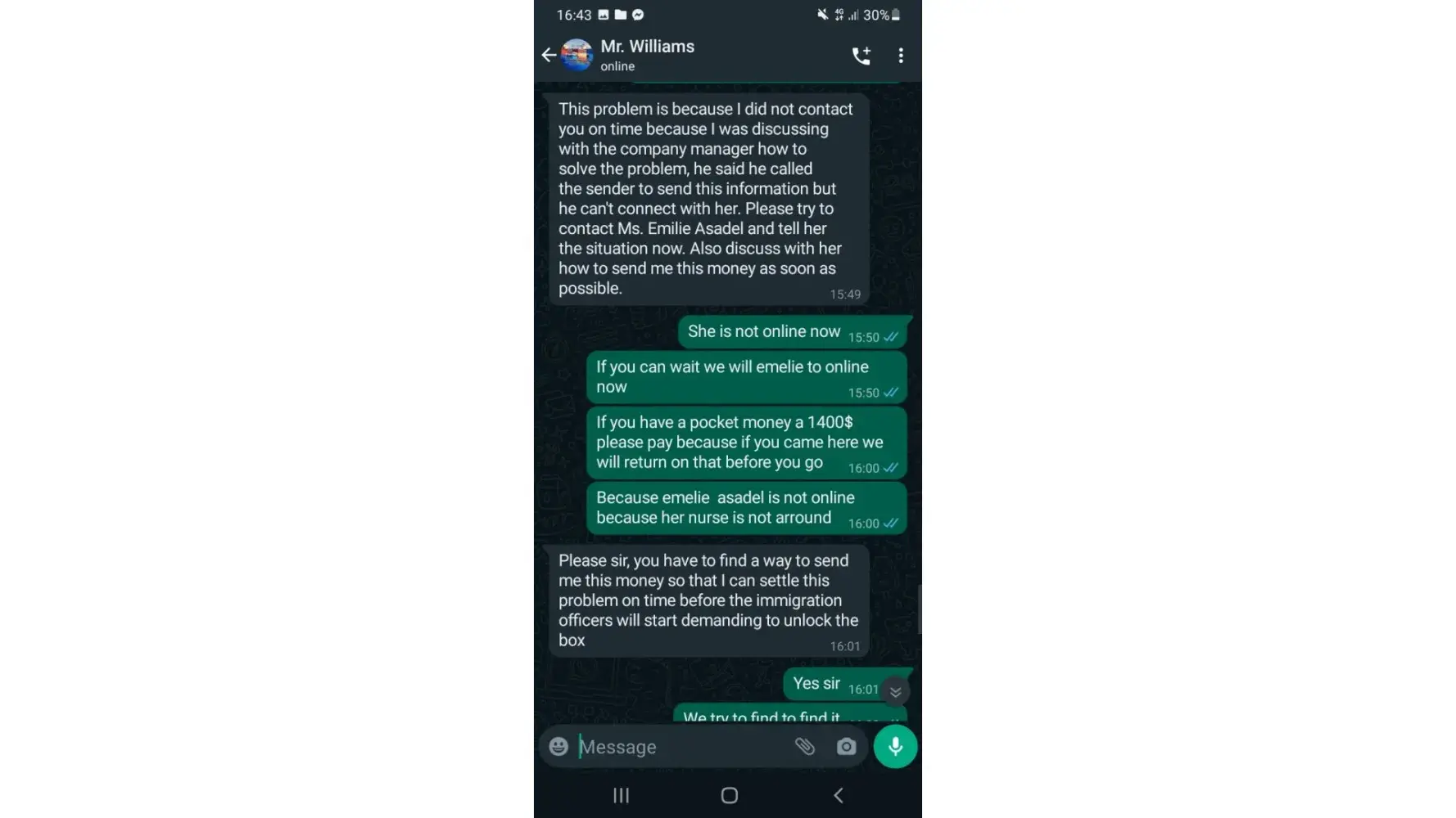 THIS IS THE ONE PERSON WHO SCAM MY MONEY I LOST 1550$ because i need to pay for the taxes to recieve the luggage after he recieve after 6 hours he said i need to pay additional for the insurance that is the reason, thats make me to think. Mr.Williams Peters is the delivery man and the sender is EMELIE ASADEL i have a lot of evidence here.
