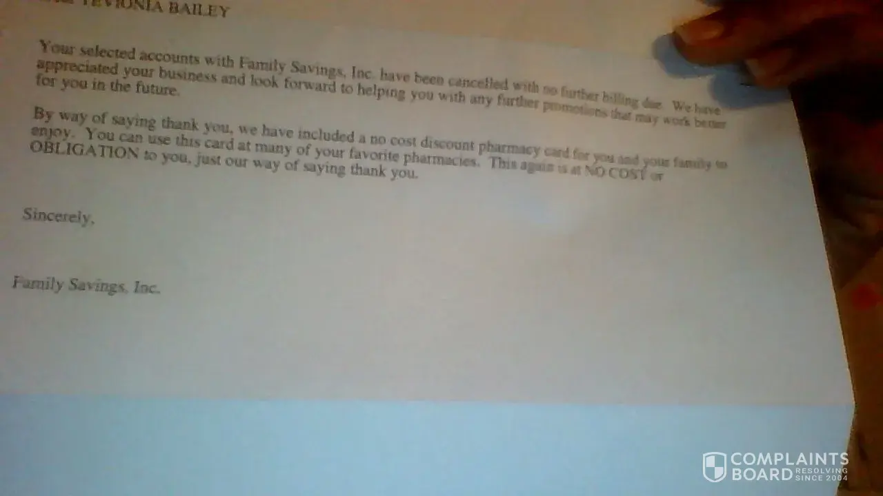 I spoke to a lady today about money being charged to my account. She said it was a payment that was turned over to the collection dept because I didn't cancel on time. So, there would be no more charges because I cancelled. Now, I was told that I would receive my $100 dollar gift card online and to check my email...I told her to let me know what the name would be because I can't find it under their family savings name. She told me to look for the NO REPLY @EGIFTCARDS.COM. I did.nothing so far. so, I will call my bank and let them know that the company was cancelled and if they can't stop them from withdrawing money, I will change my card. Oh well, that is how the cookie crumble