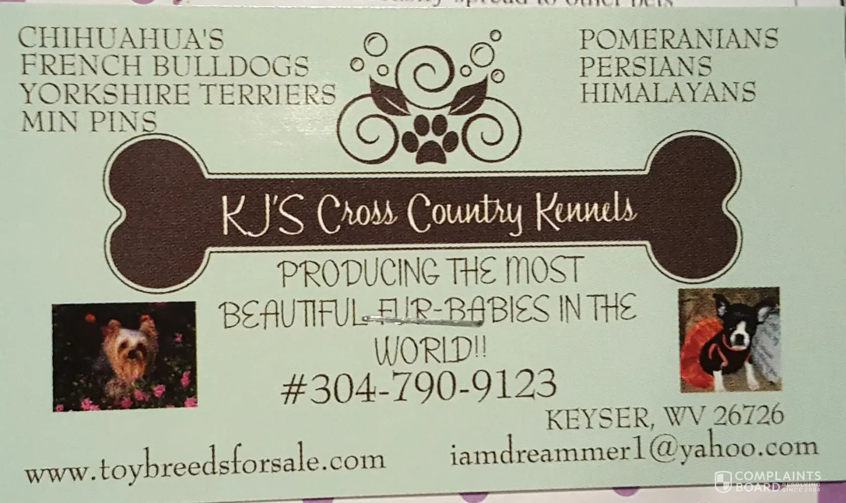 Please do not buy from- KJS Cross Country Kennels / Joann Moore, Keyser WV/ www.toybreedsforsale.com : I purchased our French Bulldog Chihuahua Mix Female on 7/24/16 and during our drive home, she threw up 2 times though we assumed this was due to the 2 1/2 drive home on curvy roads. And then threw up again a couple hours after getting home. Therefore we...