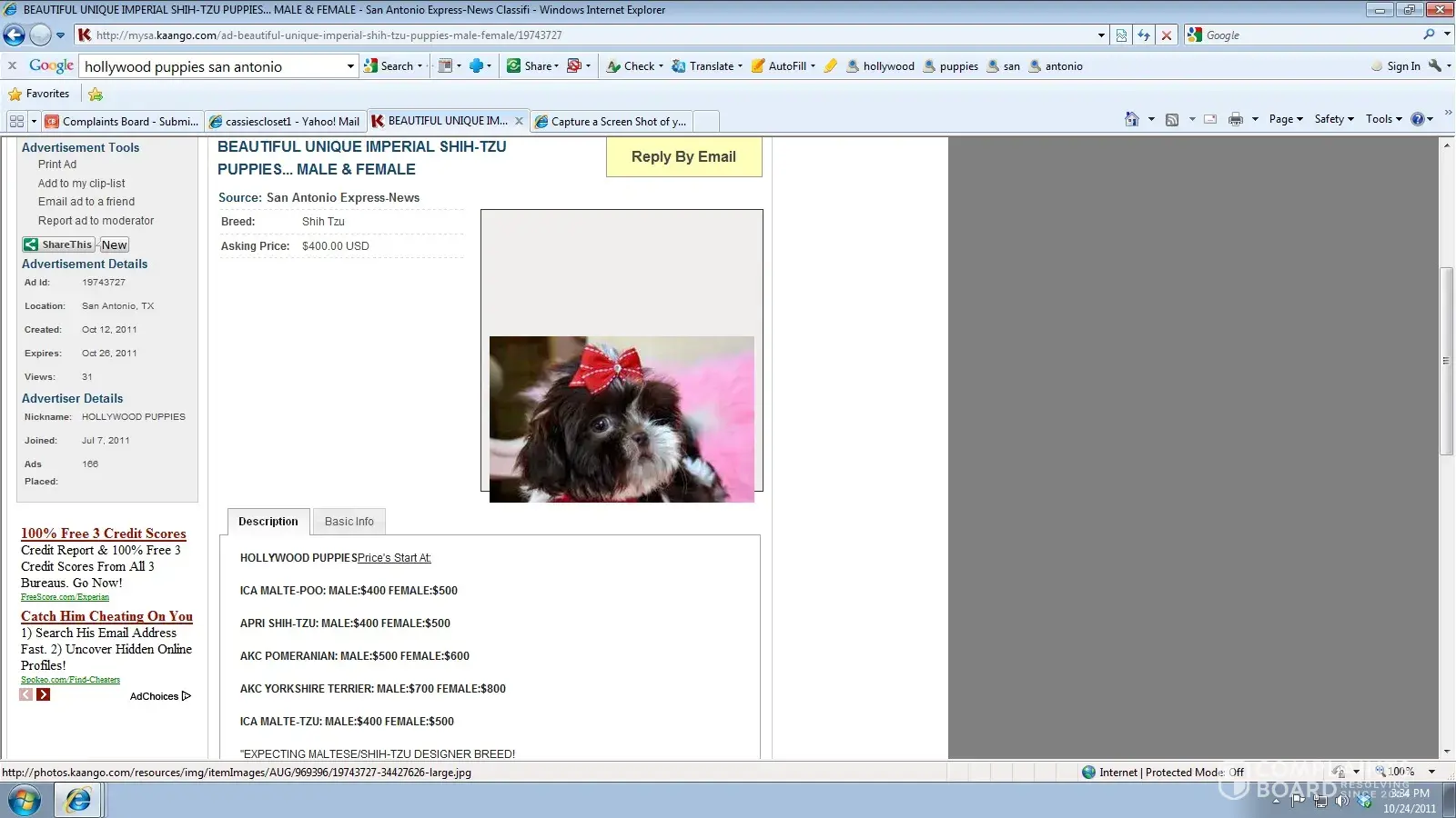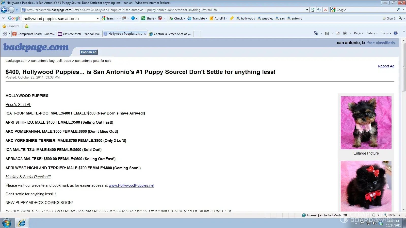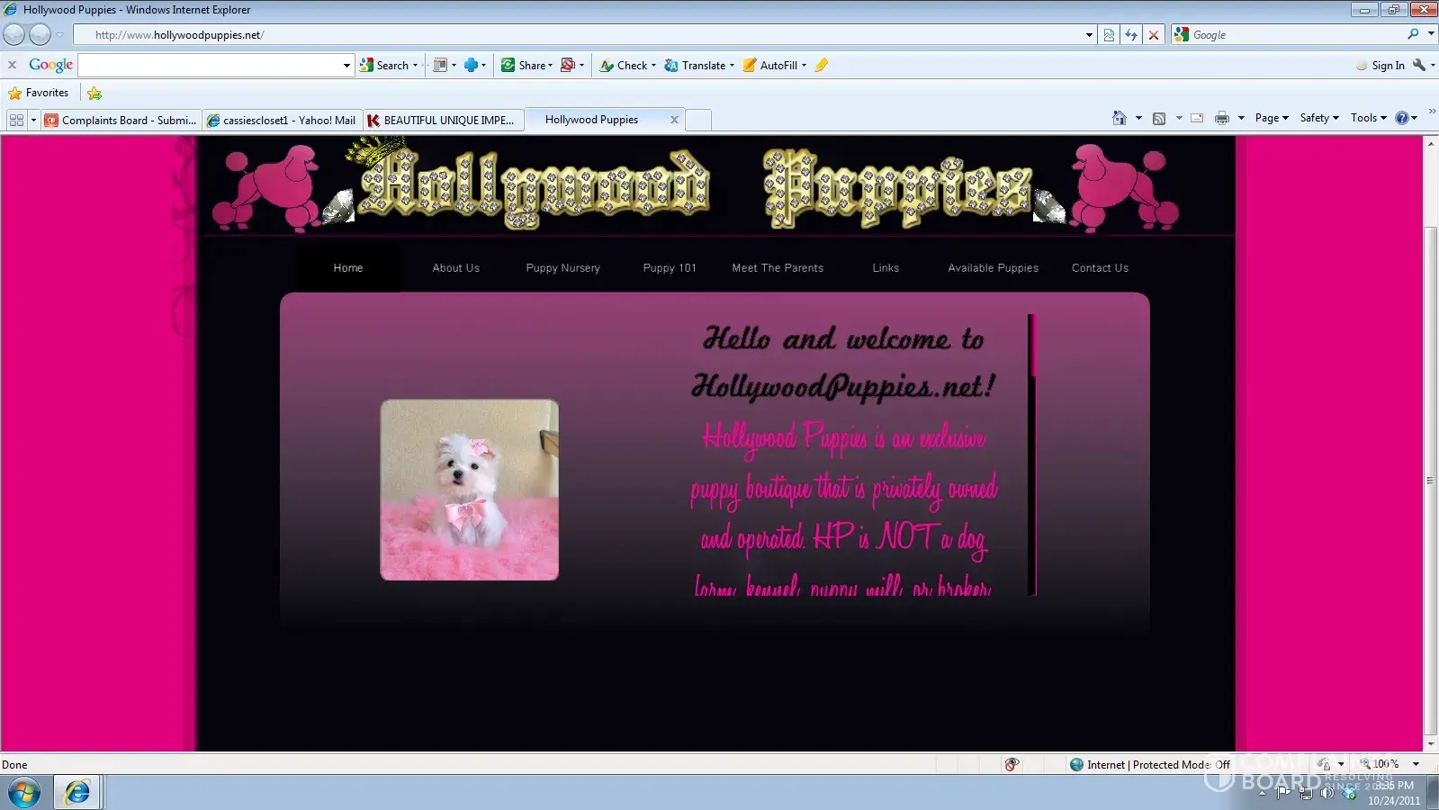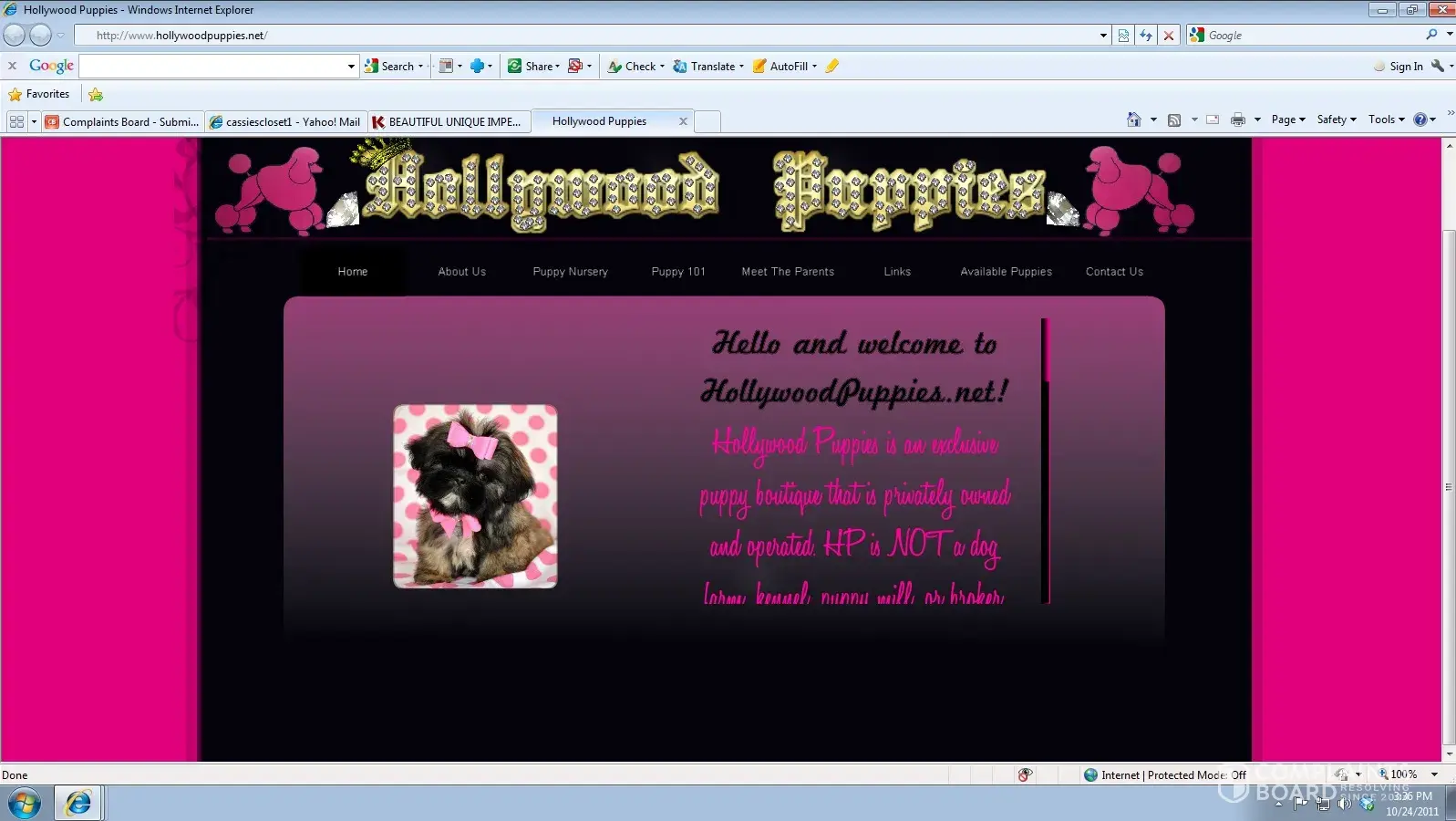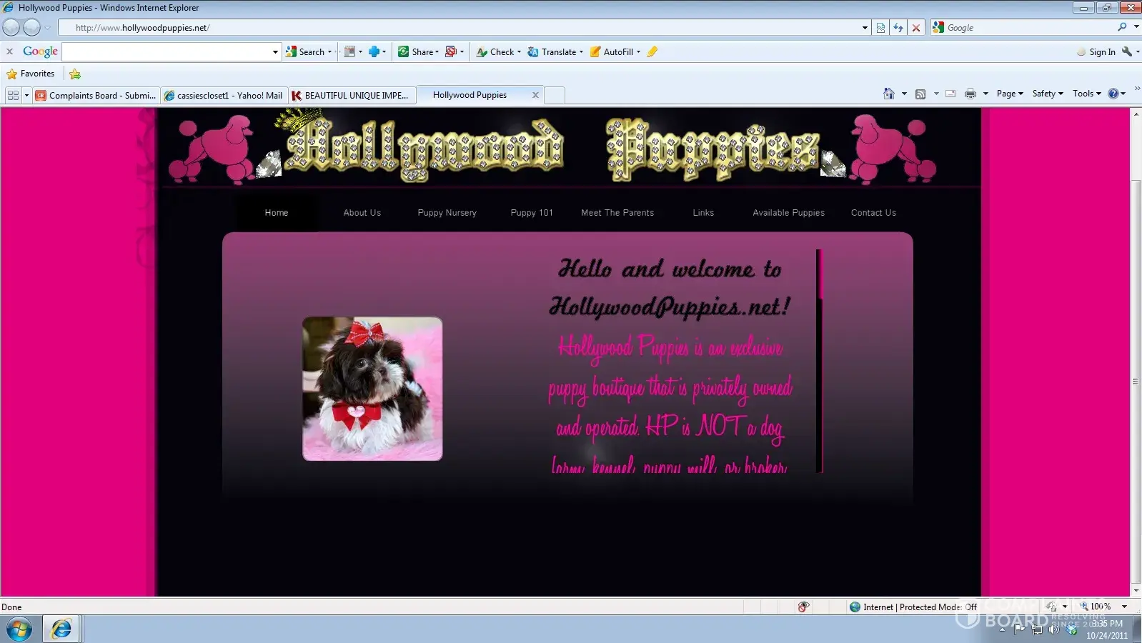Hollywood Puppies is using pictures from my website to misrepresent the puppies they are selling. They are using my pictures on their website and online classified to trick buyers. Go to their site and you will find the stolen pictures on their home page. Below are some screen shots I took of the online advertising and website with our photos. Below is a...