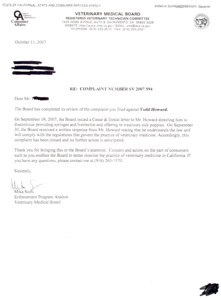 Animal abuse, as told by ex-employee. Todd Howard aka www.bigbulldogs.com … Fallbrook California [protected]… STAY AWAY. DO NOT BUY HERE. Todd Howard, suspended from AKC, American Kennel Club (falsifying documents), AND State of California issued a Cease and Desist Order (Writing dangerous Drug Prescriptions without a License for pets) has complaint...