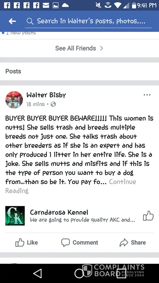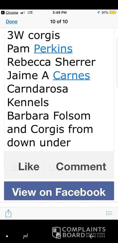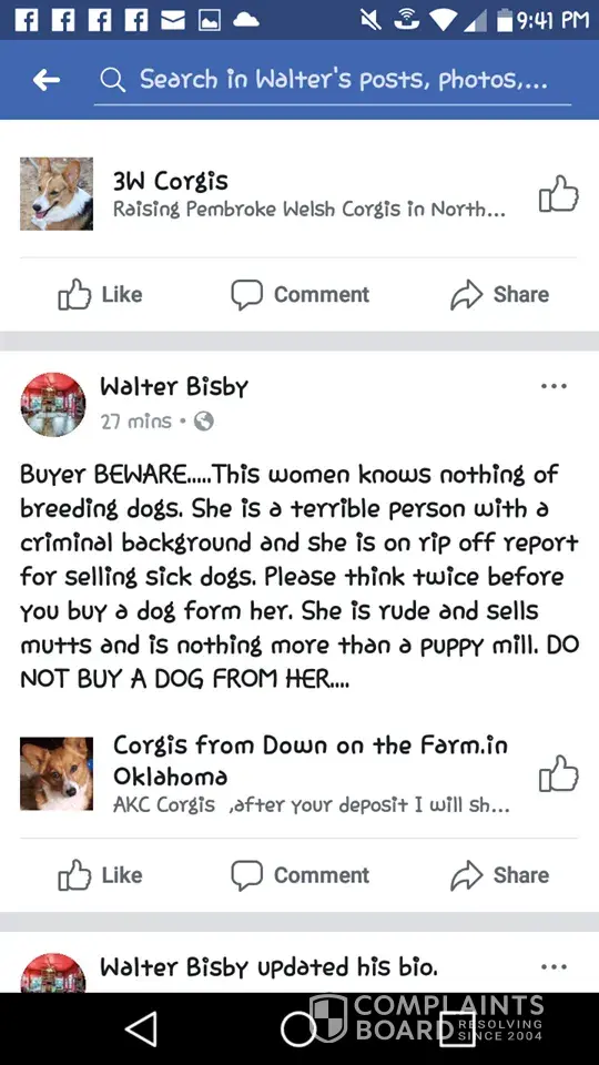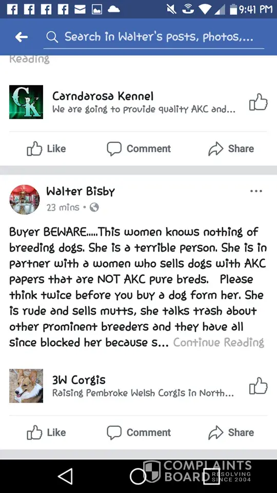 Elizabeth Chism contacted me on Facebook Messenger about a pup they have available. I looked at the pup picture and was not interested. I said the pup isn't red enough. I am looking for a pup that perfectly meets AKC Standards. I found out she posted on her Facebook wall telling everyone not to sale me a puppy and to contact her for my information. I...