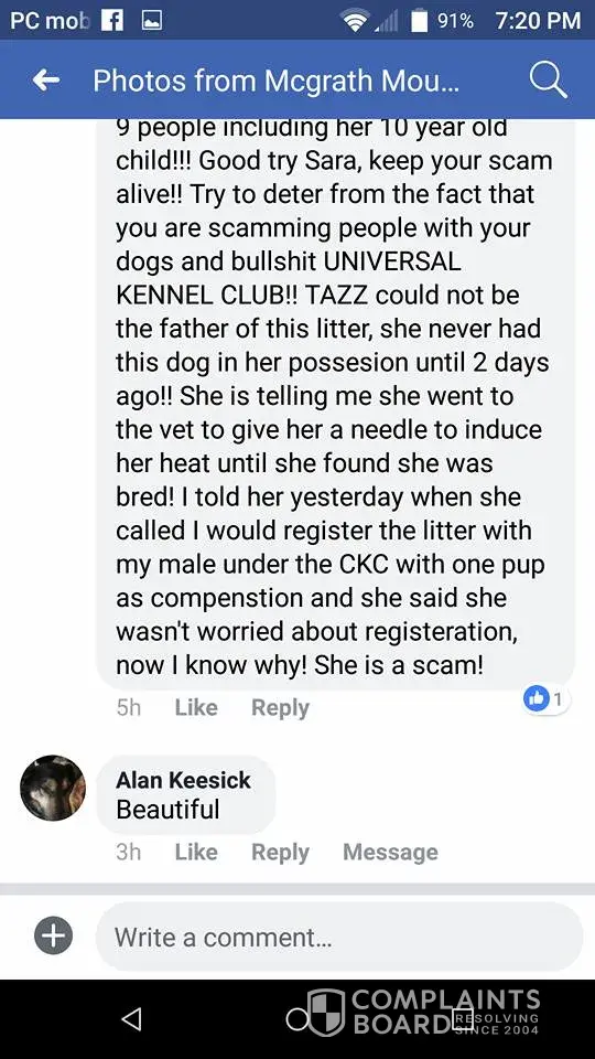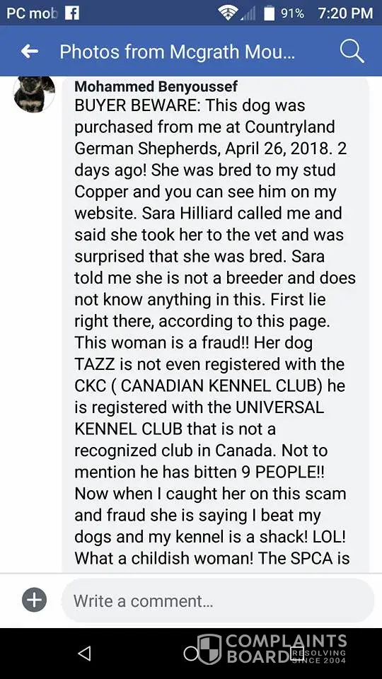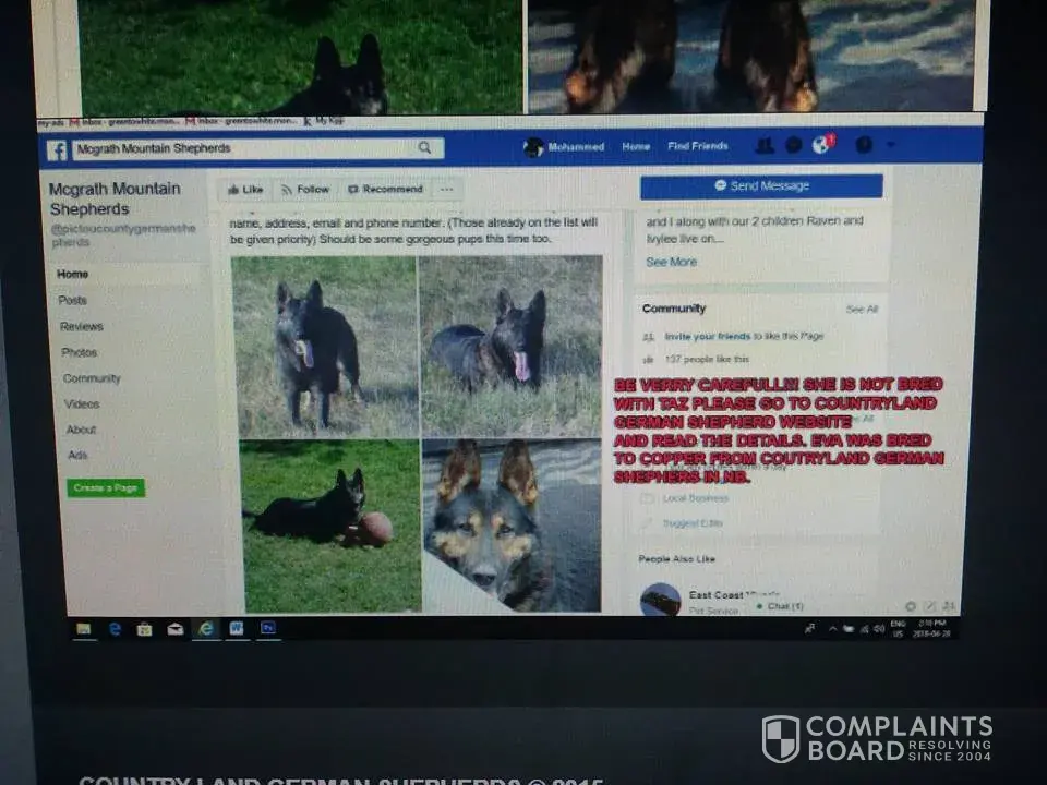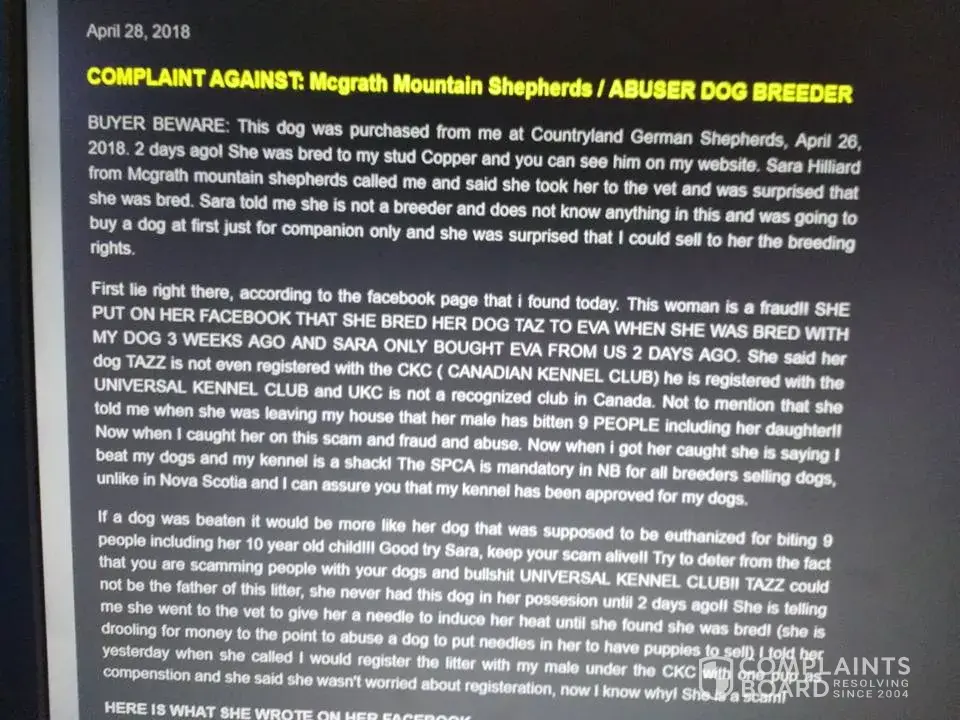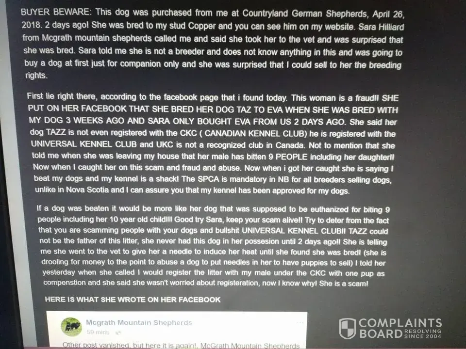 BUYER BEWARE: McGrath Mountain Shepherds / [protected] sara hilliard (BUYER BEWARE) SCAM! Please check my website http://g2w.ca/gsd/report.php (BUYER BEWARE) I wrote the details and what she did. She posted on facebook that Eva was pregnant with her male Taz 2 days after she bought her from us and when I caught her on that and posted it on facebook to...
