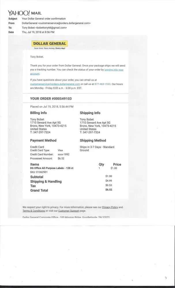 My name is Tony Bobet. I am filing an complaint to Dollar General online. I order item on July 19, 2018. And, I supposed to received on July 24, 2018. The item is D-G Office All-Purpose labels 128 ct. I pay for $6.52. The UPS.com suppose to deliver the package on July 24, 2018. They want me to pick up the package. I file an complaint to Dollar General.com. They locate at 100 Mission Ridge, Goodlettsville, TN 37072. Telephone, [protected]. i try to contract them and stop picking my phone. I want an full refund. I just received the item open. My brother open the package with my permission.
