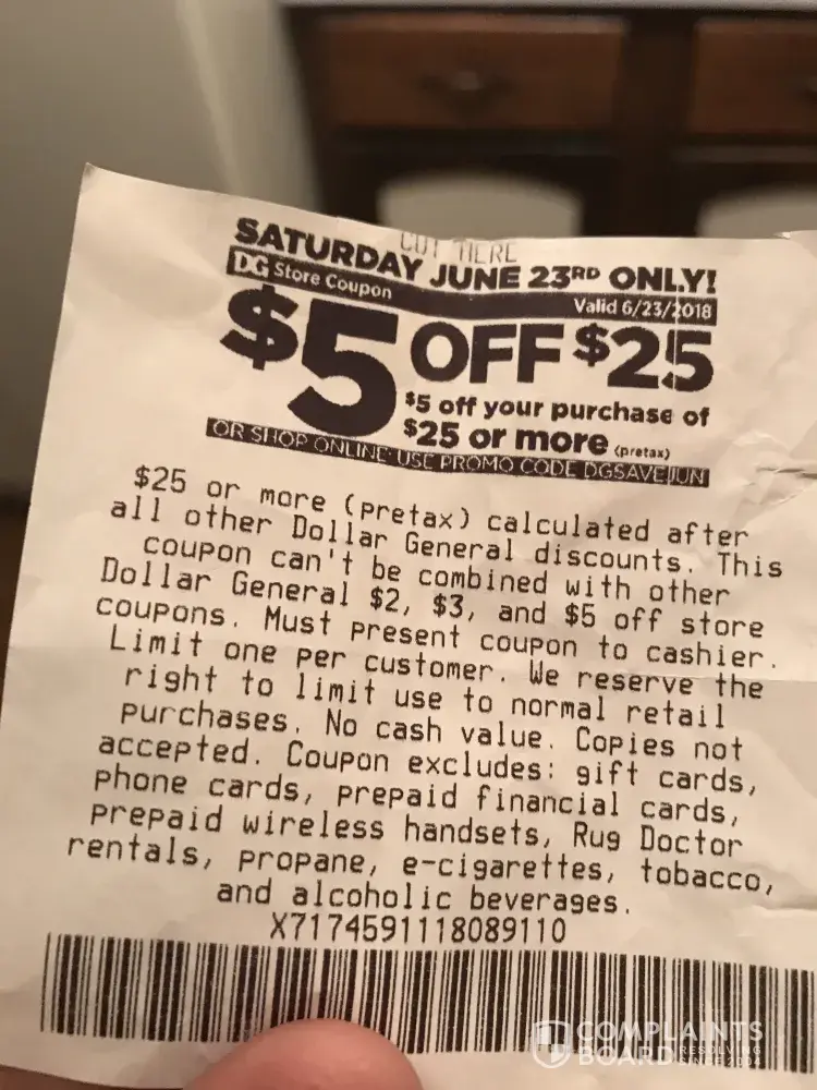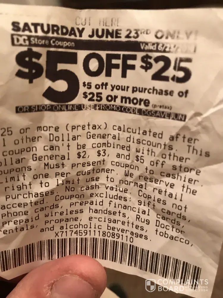 Dollar General $5 off $25 issue not given and was told it was used when it was not.