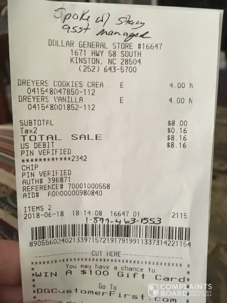 I accidently left a bag of the products I bought ($9 bottle of gain beads, 2 bottles of japanese cherry blossom body spray) and she had put the receipt in that bag. I was in the store about noon. I drove from the pacific store to berger mo, about 53 minutes away. I called the store today when I realized what i'd done (about 6 pm). The person on the phone did not identify herself and said she would call her manager and call me right back. It is now 7:41 and I finally had to call her back. She was arrogant and hinged on being rude. She said there was nothing she could do as I did not have the receipt and there was no bag there. I told her the receipt was in the bag... Again. She repeated that there was nothing she could do and said if I wanted to argue the point I would have to drive back down there and argue with the manager but the result would still b the same. Now u tell me... What went totally wrong with this conversation? At this point, I want my money back and I will spend my money somewhere that cares about their customers. I have spent about $100 a week consistently for years st dollar general. I'm saddened to see how far the stores have sunk. If I don't get my money back with taxes, I intend to call the bbb and file a formal complaint. Please respond promptly.