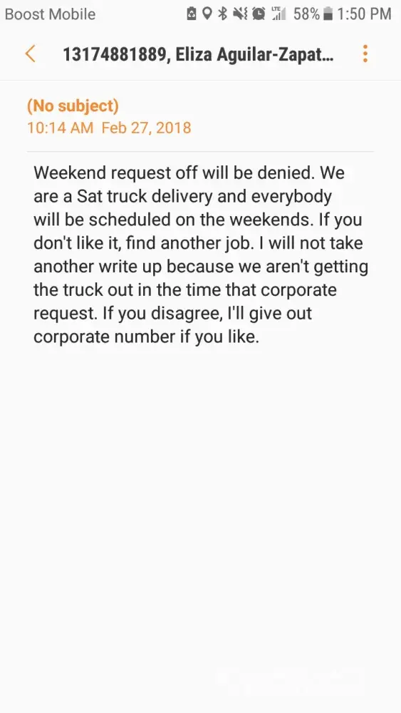 - We were basically told that we were no longer permitted to have weekends off for any reason, and if we didn't agree with that to find another job. When one employee, an assistant manager no less, tried to quit, she convinced him to stay by giving him every weekend off.