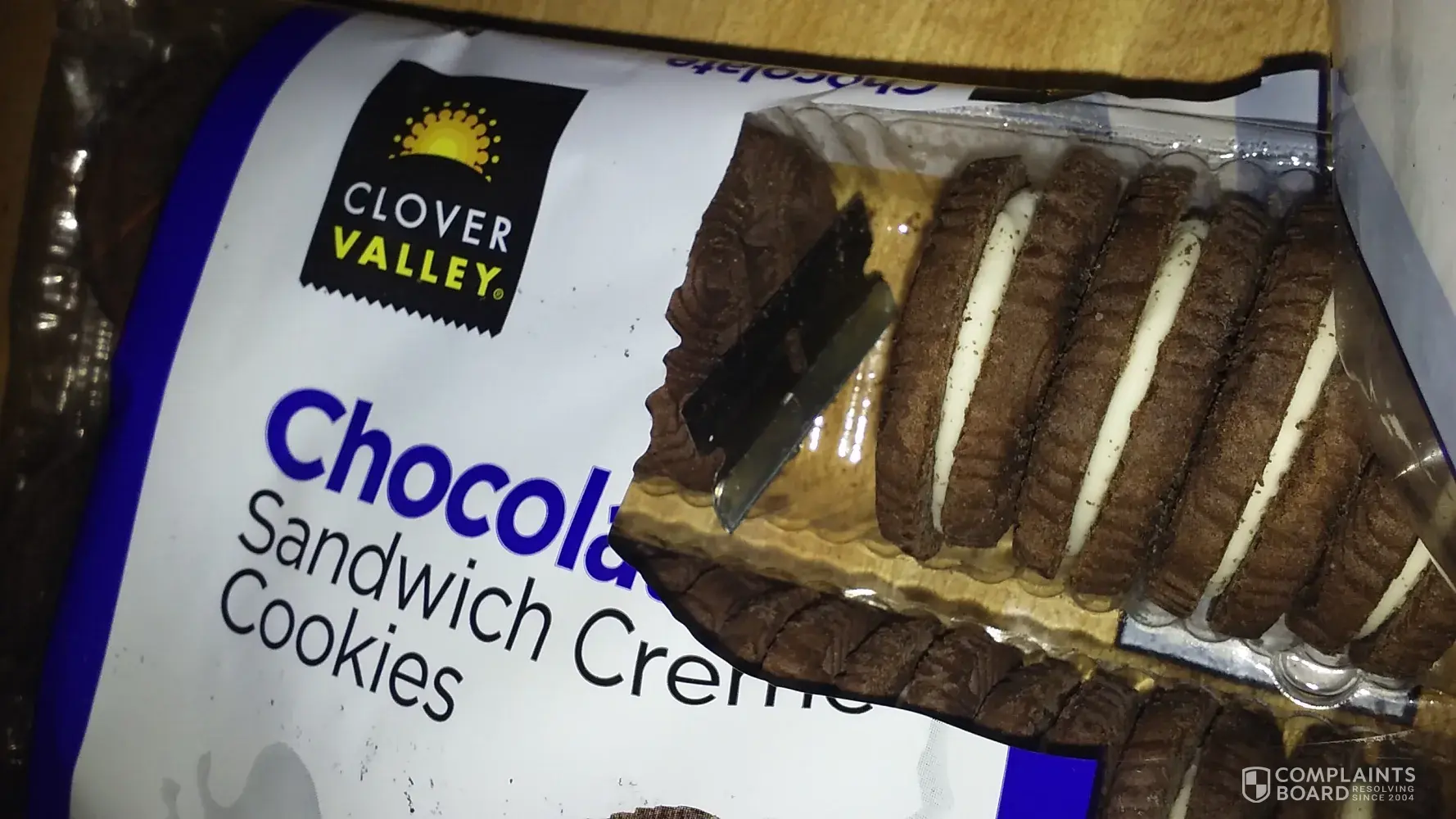 I purchased a 13 oz package of Clover Valley Chocolate Sandwich Creme Cookies from the Dollar General and when I opened the package when i arrived home, i took 5 cookies out and was about to hand them to my 4 year old when i noticed something silver in the pack! It was a RAZOR BLADE! Wth is a razor blade doing in a package of chocolate cookies?! Very disappointed & PISSED about this! What if my 4 year old had opened the pack instead of me?! I took pictures and will spread them to let everyone know about this! And its not the stores fault! It came from the manufacturer like this!