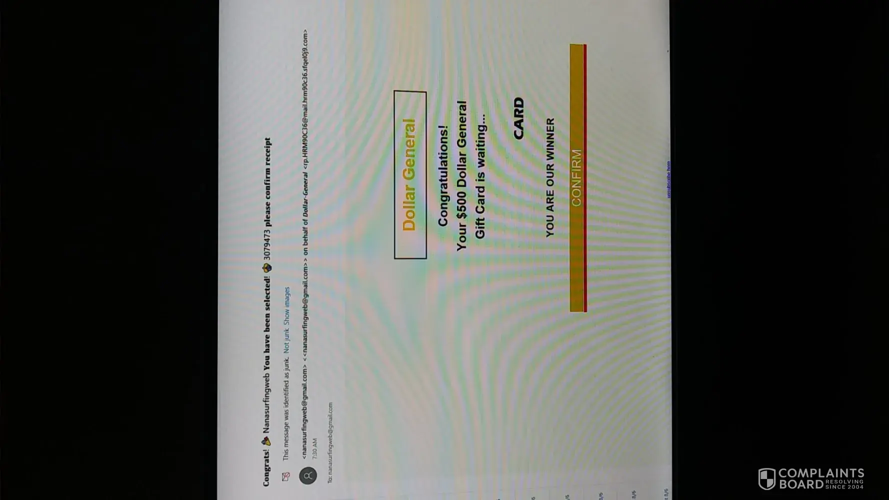 I filled out a survey on my receipt I received when I shopped at Dollar General in Weare, N.H. I did just for fun but soon after I received an email stating I won a $500 gift card from Dollar General which I was so excited about, and it was so unexpected. I know the email is connected to the survey but Dollar General claims it happens without their knowledge. The email wouldn't let me submit my claim or do anything at all with the email. I have submitted a photo I took of proof because it was all very disappointing and annoying. I am a 70-year-old retired widow who took the time to say how much I like Dollar General and feel hurt by this all and surveys are always quite long, funny that, and want all your personal information, odd that but I do them on occasion just for fun and hoping to get lucky. These are desperate times so to be disappointed by something like this is so very sad and annoying and makes one feel bad. The receipt from Dollar General asks you to fill out a survey and give your opinions on the store and your shopping experience and you get a chance to win a $500 gift certificate. I simply was just taking a chance. Never expected this type of disappointment. Thank you for listening. Linda Moriarty 36 Laurel St. Manchester, N.H. 03102