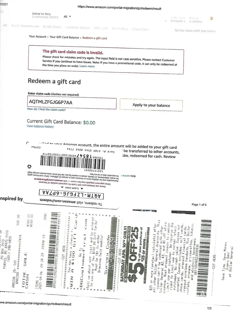 On 4/6/21 I bought 6 Amazon gift cards, when I tried to use them 1 showed as invalid. I contacted Amazon and they said that the point of purchase was responsible for a refund. When I went back to the store the manager told me that Dollar General was not responsible for the card. I want my money back on the invalid card. Store number is #03393. Amount of gift card is $100.00. My name is Terry Cooper 24 Wilczek Rd. Lumberton, Ms.