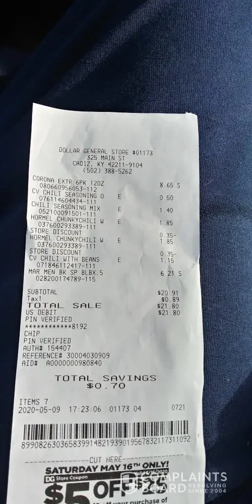 On may 16, 2020 at 8;36 am transaction# 890740319218039914510926910419913013321681 my item was # [protected]-105 >35lb dog chow I was a customer in dollar general in which I shop if not everyday but every other day, when an associate name doug spoke with the cashier and said I am so sick of people coming in here asking for something hell if they don't see...