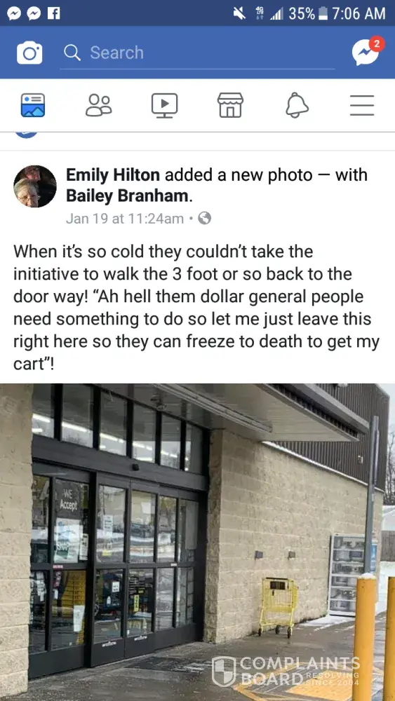 There is a Facebook post by Haley Page that need to be check into. Two female worker in Huntingdon TN treated a man very poorly due to his race. The things that were said to him were very inappropriate. Something should be done about this kind of behavior. This is a copy of the post "My feelings are so hurt right now...people are so mean. I was at dollar general here in Huntingdon and as I was doing some shopping I heard a lady say "What the hell are you looking at? Everytime I look up you're staring at me" I didn't hear anything else. So as I went to check out I got in line behind a male Mexican. I could feel the tension in the air but I wasn't for sure what happened. As he started checking out there's two woman workers and one is sitting there staring at him and the other is checking his items out. His total was $20 so all he had was 1s and he was slowly bringing them out one by one. The lady was getting aggravated and was rolling her eyes the whole time. He only gave her $15 and gave him attitude and said "that's only $15" so he started giving her more and she aggressively took it from him. He grabs his change and starts walking out while the other lady worker was sitting there with her arms crossed and giving him a bad look and the man said "what are you looking at? She literally shewed him out the door and yelled "GO BACK TO WHERE THE WALL IS" I was beyond furious and i asked her what he did? And the girl couldn't even give me a good reason and said "he was just staring me and we've had problems since he's came in" (I was there just as long as he was and I didn't see him cause a bit of a problem!) I responded and said "well that was very harsh what you said" she said "I don't really care" I said "you didn't have to tell him to go back to the wall that was very harsh of you" her response was "I'm white, what is he?!" I straight up told both of them they will NOT be getting any more of my business that that was very uncalled for. And walked out. If I wouldn't have already paid for my stuff I would have told them to keep everything and walk out. My heart was broke and I felt so bad for him 😞 it's people like her that just crawl under my skin! all I could do it cry bc people are just so mean and hateful and don't care 😞"