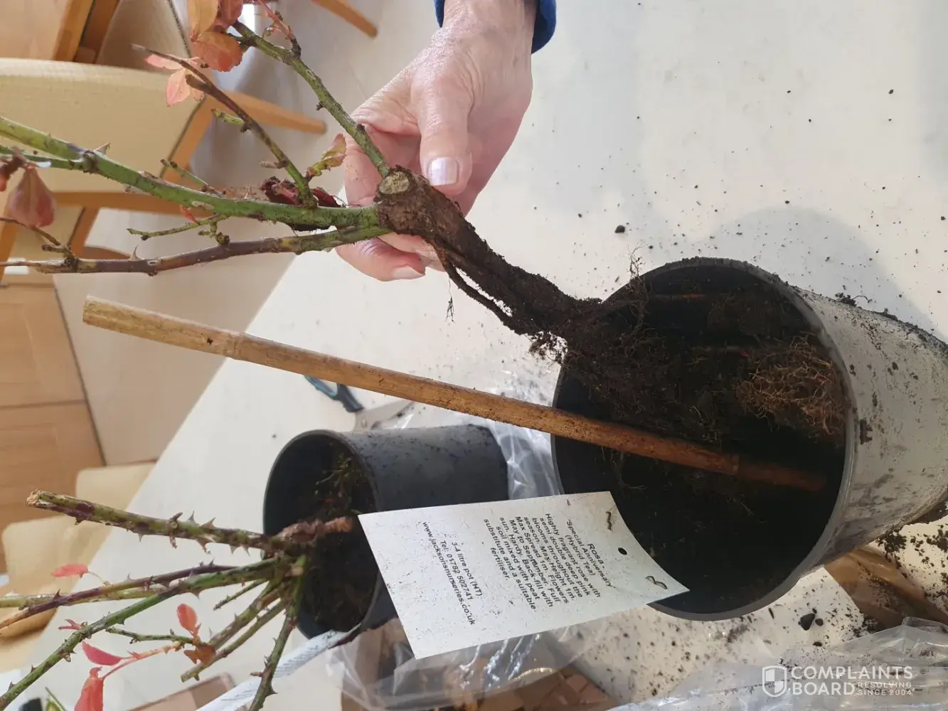 Three roses were delivered a week late and in very poor condition. We were here but The delivery man didn't even bother to ring the doorbell? I have enclosed photos. One pot had virtually no soil as it was all at the bottom of the box. One other pot is split and damaged. One rose may survive (?), but I am not impressed at all. The soil is dry and...