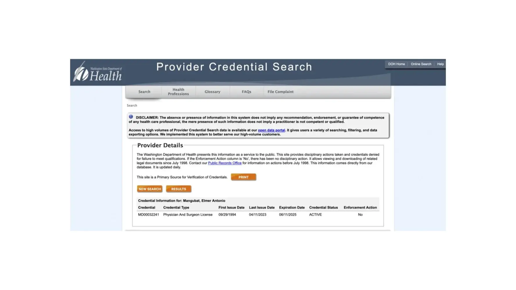 Also anyone can verify the start date/first issue date (9/29/1994) of Mangubat’s Washington State license on the Washington State Govt website (link below). Just search for Mangubat by Last name: Mangubat and First name: Elmer (Elmer is the “E.†in E. Antonio Mangubat). Mangubat’s Washington State Medical License/Certificate No. is MD00032241: