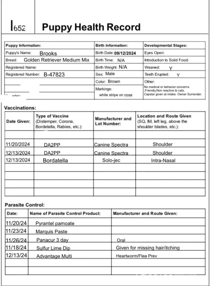 Company reuses the EXACT form I got in 2020 from East Dallas Pet Rescue (number 652) and whited out in the same areas TODAY. See mine attached. My dog from them was in NO WAY the breed mix described and came with an active flea infection, hookworms, tapeworms, giardia, and kennel cough. When I told them this, they asked how clean my house was!? In...
