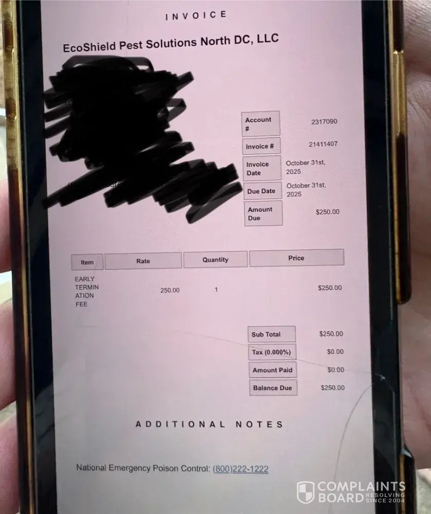Invoice #[protected] when we moved into this house we signed up for pest control service serviceman was here twice and did not take care of our pest problem we had paid for an annual membership but had to cancel and we tried another pest control service that was much better and now we are getting a bill from eco shield for what I don'tknow I do not owe this and it looks like expiration to me.