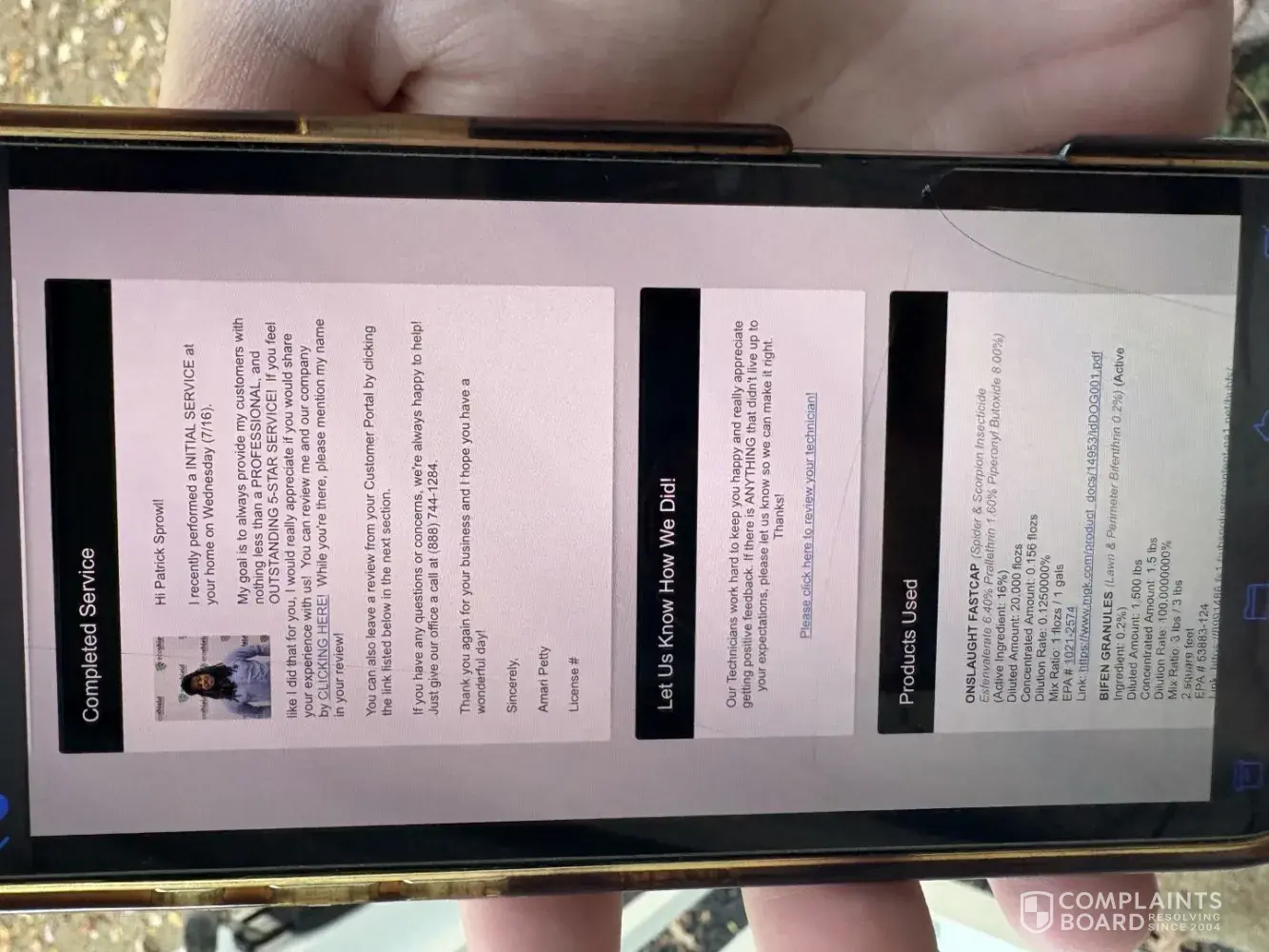 Every time I received service, it was followed by an increase in the number and variety of insects inside my home (I have pictures and videos to prove it). This was to such an extent that the company had to send representatives back out each time, resulting in more time windows to keep open, stress for my dogs, and so on. However, every follow-up visit proved equally unproductive, as is evident in my video documentation and my purchase history on Amazon, which shows the bug killer products I used to take matters into my own hands. I voiced these complaints, but they were ignored.