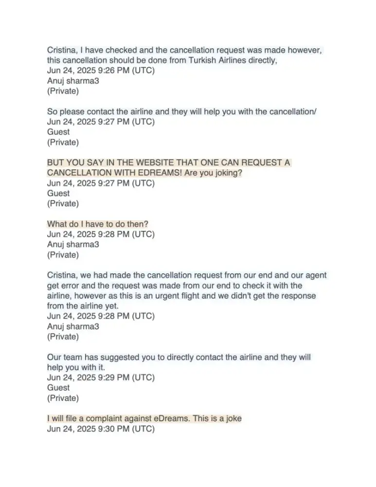 I contacted eDreams customer service, and they falsely told me that the airline had changed the flight and that they couldn’t do anything about it. They completely washed their hands of the situation, leaving me without a solution and showing a total lack of consideration for the customer.