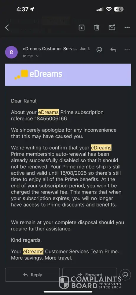 Dear eDreams, I am writing to formally complain about an unauthorized annual Prime subscription on my account. I did not consent to any annual Prime subscription and request a full refund for the last five months, along with confirmation that no further charges will be made. I was charged monthly without my knowledge, and my account was then converted...