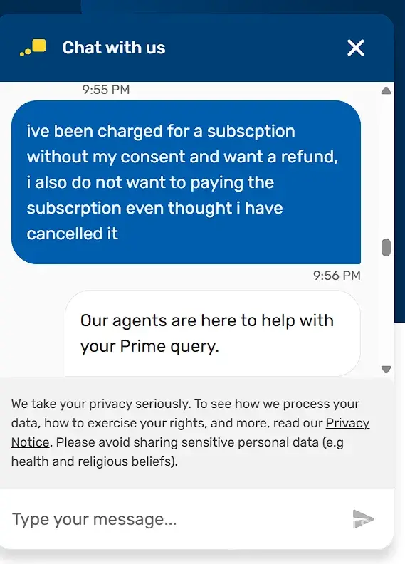 I was unaware that I had a prime membership, and I was charged €95 without clear prior notice. When I requested a refund on the same day the charge was made, I was informed that I would not receive a full refund.