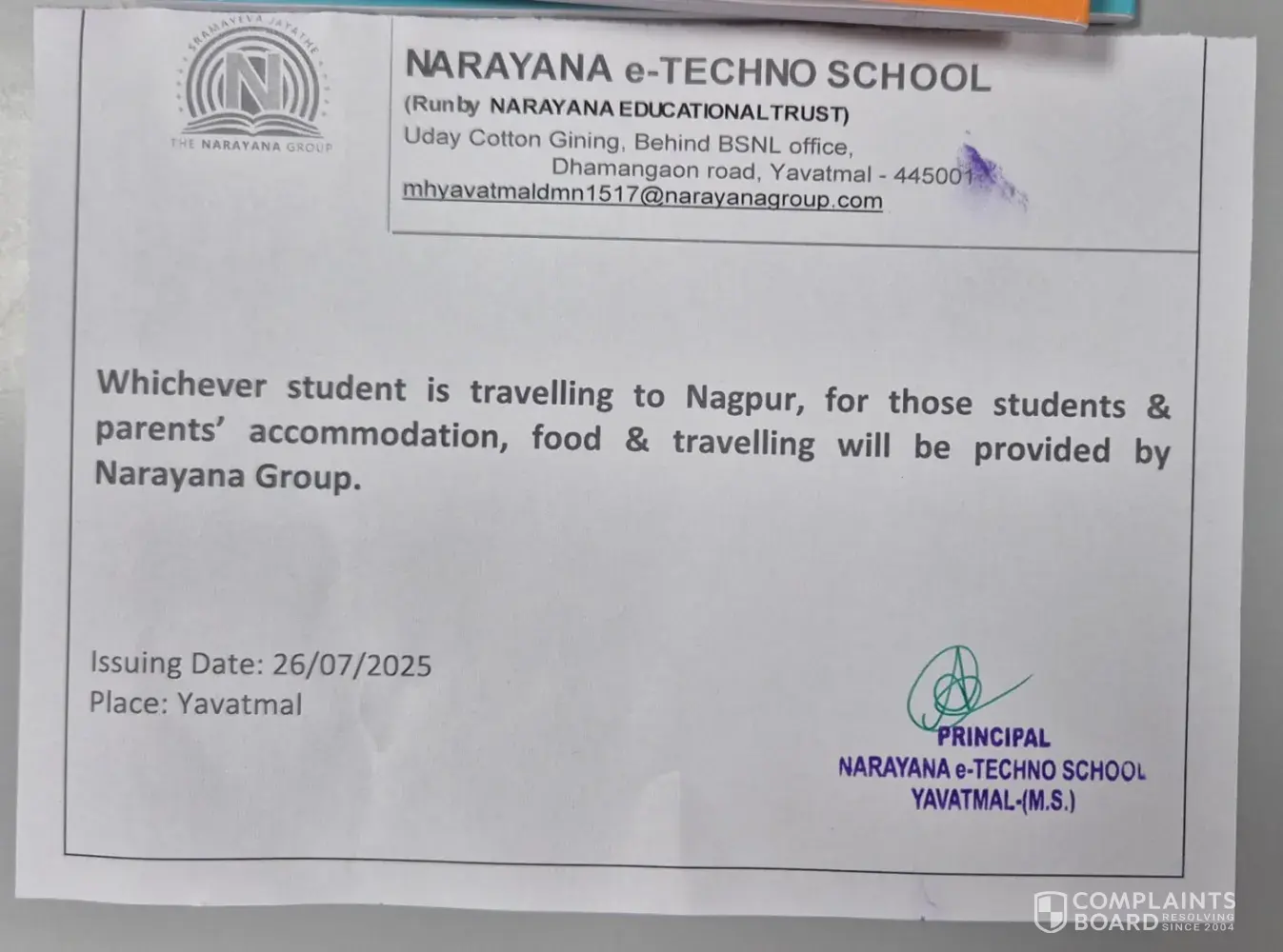 Read full complaintNarayana ETechno School Yavatmal - Naryana school yavatmal affiliation status misleading for 2 years