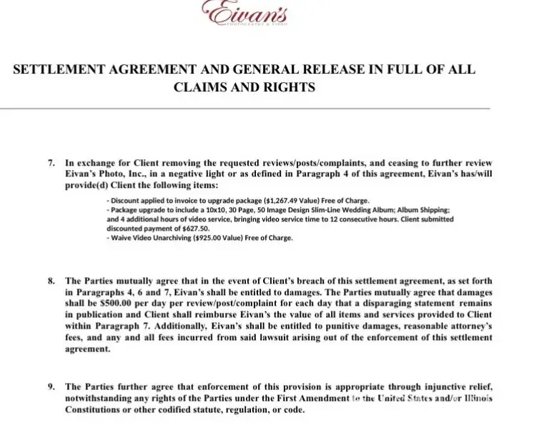 to photograph my October 15, 2022 wedding. I found them on The Knot. They were reasonably priced and the reviews I read were good. I wished I’d dug a little deeper but I could never have imagined what an awful experience I was going to have. I work in the wedding industry and have seen and worked with many vendors. The experience I had with them is the most awful I’ve seen or been through with any company. I booked them and began making payments in December 2021. I made my payments on time monthly and I finished paying off my package in September 2022, 30 days before my event. At the time of booking, I was asked to fill out a form with my top choices based on portfolios posted on their website. I did so. I was not assigned a photographer until about a week before the wedding and did not speak to her until the Monday before my Saturday wedding. She was not among my top choices. She was aware of my contract which stated I had 10 hours with her but added her own hour to the beginning of the day without my permission. I believe she did this because she was extremely slow at taking pictures. I can’t remember what time she arrived to the hotel but my bridesmaids said she took forever with the detail pictures. She also took a very long time at cocktail hour which threw off my timeline. She was rude to everyone but me and almost gave my florist a heart attack when she walked over, grabbed my bouquet and started shaking it. At the end of the night, I was asked to sign a form which she says was to confirm that she had taken all the pictures I wanted. Being my wedding night, I was tired, a little intoxicated and I signed the form without really looking at it. Apparently, included on that form, were her hours with the added hour. Shortly after the wedding, I received an invoice for the additional hour which I did not agree to. I had to schedule an appointment with a manager which was also the day that the payment was due. She basically told me that the photographer thought I was great and I signed a form for the additional hour. I went ahead and paid it because I didn’t want that to delay my pictures. Pictures I will never get anyways. Per my contract, I was supposed to receive my edited, downloadable pictures within 30 days of my event date. I received a gallery of my pictures that were not printable and had their insignia on them. I was told in an email that the gallery would expire in 90 days and then I would receive my pictures. I did receive an email that the gallery was setting to expire and my pictures were being prepared to be sent on 2/3/23. I did not read down further where it stated I would need to sign a form so that my pictures would not be archived but I never imagined that I would have only 14 days to sign a form and my pictures would be archived. I have never heard of a company archiving pictures so quickly. When I emailed Eivan’s on 2/17/23 to ask about the status of my pictures being sent, I was told that I didn’t sign the archival form and that I would need to pay $925 to “un-archive†them. I went back to the email from 2/3/23 and realized that I missed the form which was agreeing to the archival fee of $760. When I responded to the email concerning the “un-archival†fee, they said that they could see that I opened the email but not the form. For months, I received weekly emails from Evian’s advertising their specials but I didn’t receive one follow up reminder concerning the form which is clearly intentional as they know people will pay anything to get their pictures. I asked them if there was any way the fee could be reduced as I did not have $925. They discounted it to $555 which I agreed to pay just because I wanted my pictures. I was told they would be sending me an authorization form but what I received was a settlement agreement that I would not sue them or post negative reviews. At this point, I reached out to a civil attorney who looked over my contract and the settlement agreement. She thought it was odd that their settlement agreement was copyrighted which implies they have been sued several times. I sent one more demand for my pictures via email and let them know I was not willing to sign a settlement agreement, especially since I hadn’t even received my pictures. I question whether or not I would even receive the pictures I paid for after signing a settlement agreement and paying $555. I am saddened at the loss of those pictures that I would have cherished as I get older and my memory fades but I cannot in good conscience sign the settlement agreement that I sent . I just hope by posting this that I save some other couple the pain of what I went through. Through my work in the wedding industry, I have since spoken to several photographers who do incredible work. They have told me that the Knot pushes vendors up to the top of the list who pay their high fees, not necessarily the best vendors. Vendors can also delete negative reviews so if you are solely looking on the Knot for vendors, please take that into consideration