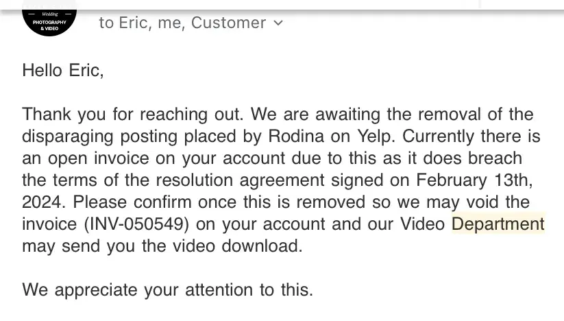 3. Additional Fees for The Full Photos and Video: When I spoke to the Sales Representative I specifically asked if I will get the raw files (in addition to the edited photos) + the full and edited video. I was told that I will get everything. It took the company 6 weeks to send us the link for a photo preview (low resolution with watermarks) and about 14 weeks to send the edited video. Me and my wife noticed that there were lots of photos that were missing. Also, the video was only 34 minutes long. When I called the Customer Service asking about the raw photo files and the full video I was told that they are not included in my package and I need to pay an additional $2,400 to get them ($1,200 for the full video and $1,200 for all the photos including raw files). I told the Customer Service representative that this is not acceptable and that I was promised to get all the photos and the full video for which she answered that they have no package for that and that I have to pay to get them. I asked her to speak to her manager and she told me “there is no one available at the moment†and she sent me a link to set an appointment to talk to management; the earliest appointment available was a month later.