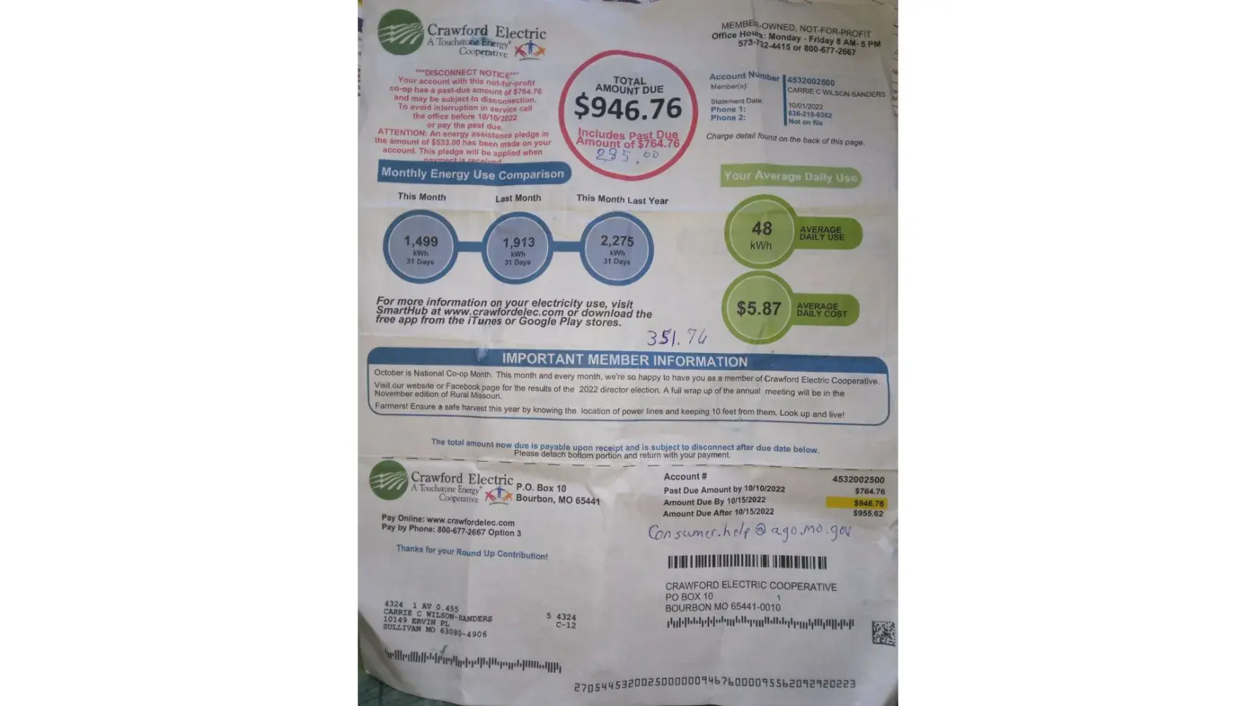 My name is Carrie Wilson Sanders. I live in Sullivan Mo at 10149 Ervins Place with my 3 children. I am low income and have been getting help with my electric bill because they had been outrageous at times and considering the situation I am going through a divorce. My oldest child has Autism and is on the Sullivan fire department. However the bill I got wa...
