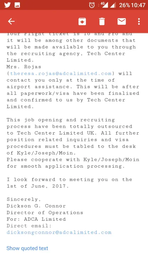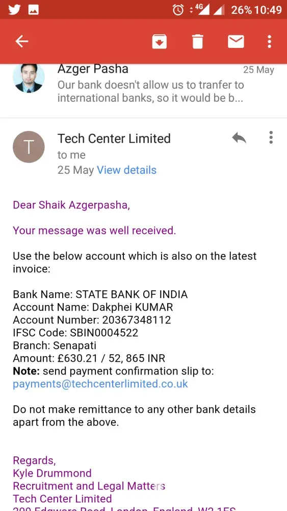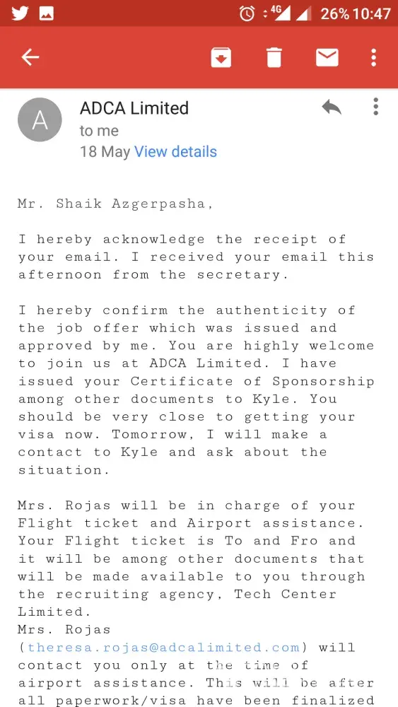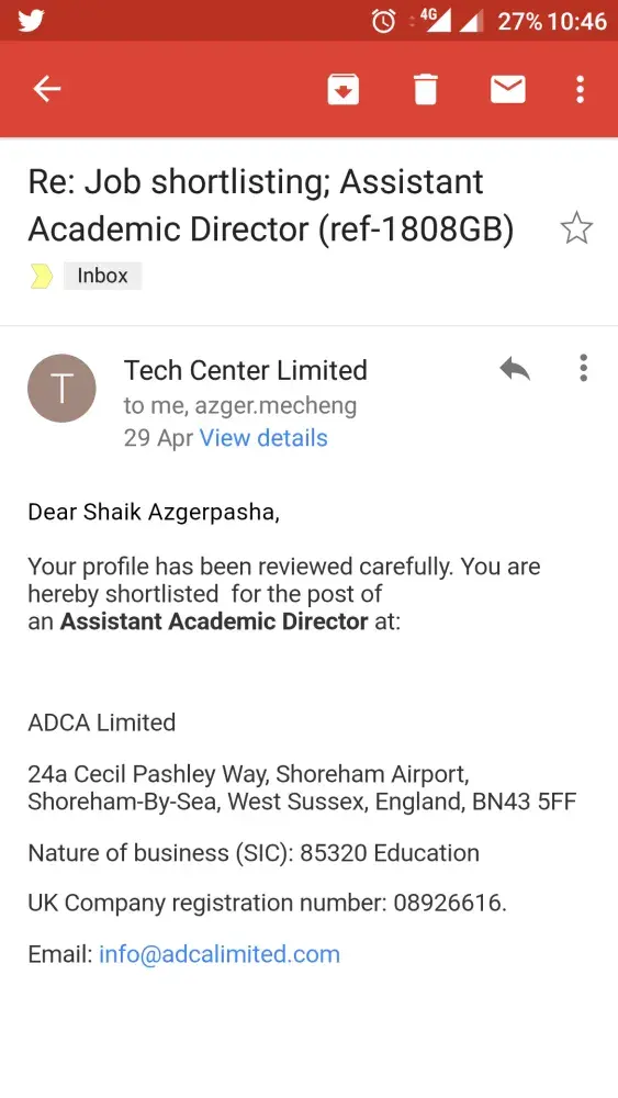 Hello, This techcenterlimited.co. Uk is a fraud who wil offer you a job and visa processing services, I have paid 2236 pounds for the position assistant academic director at adcalimited.com. Both these are fraud companies, they wil reach you with all the fake documents and call. So please dont trust them and dont loss your money. Below iam attaching all...