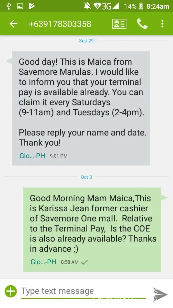 Good day! The HR of Savemore Marulas Texted me that my Terminal Pay is already available . I already confirmed the HR Officer that i will get my backpay on that day, which also The day and the time of what her want. The day i will get my voucher she said that there is no treasury, so the result is i wasted a time and also late at my work. The second time...