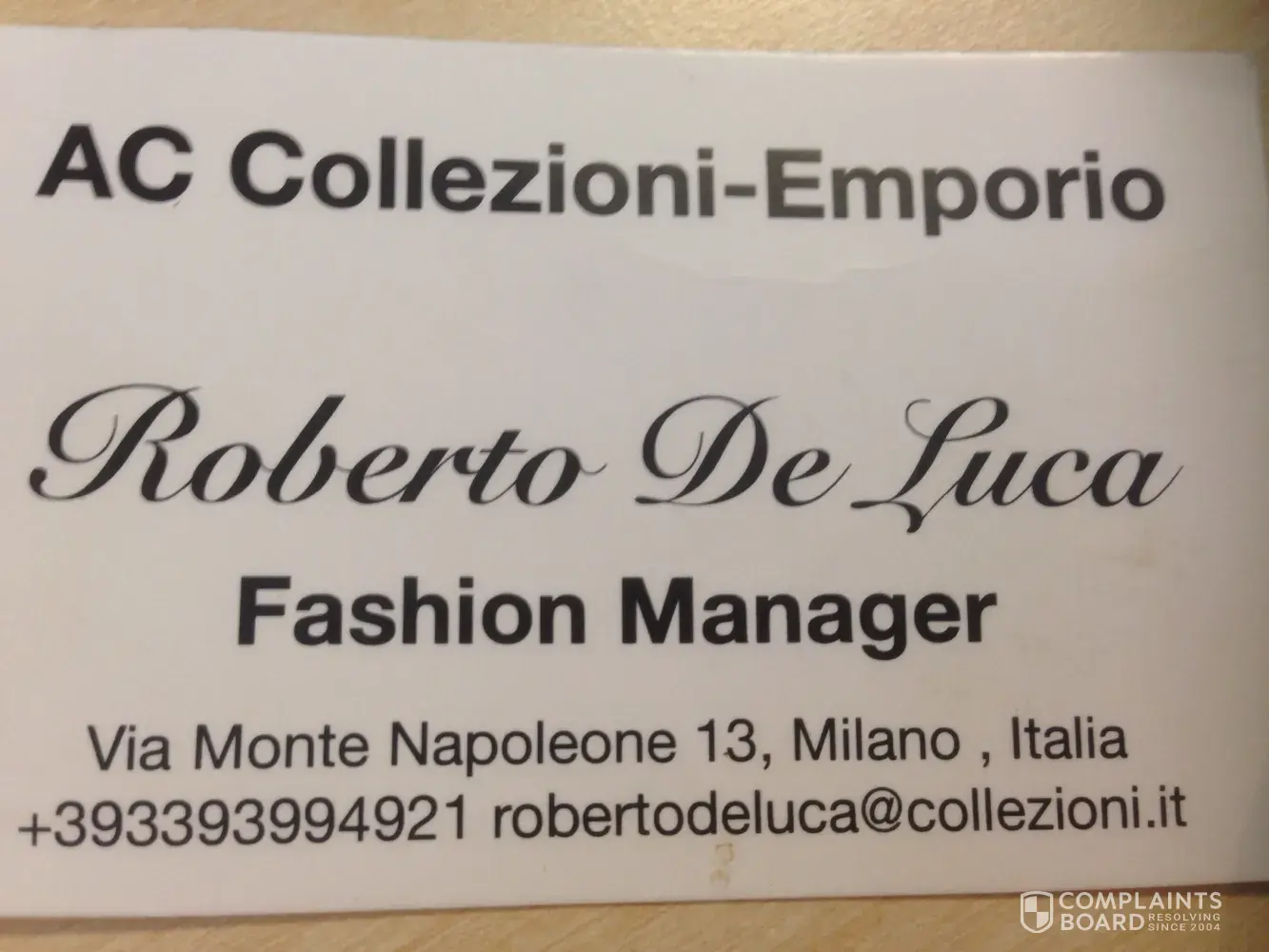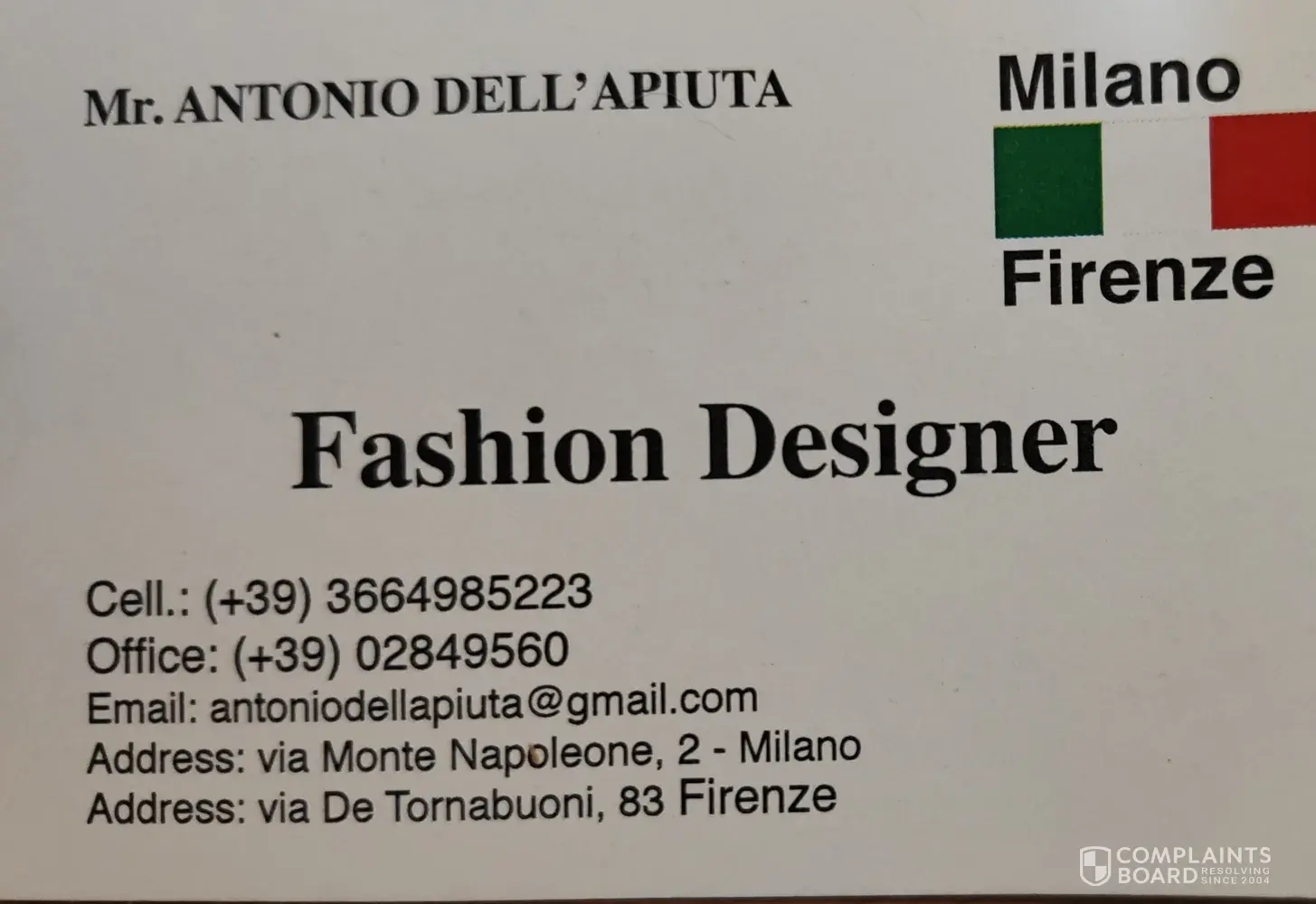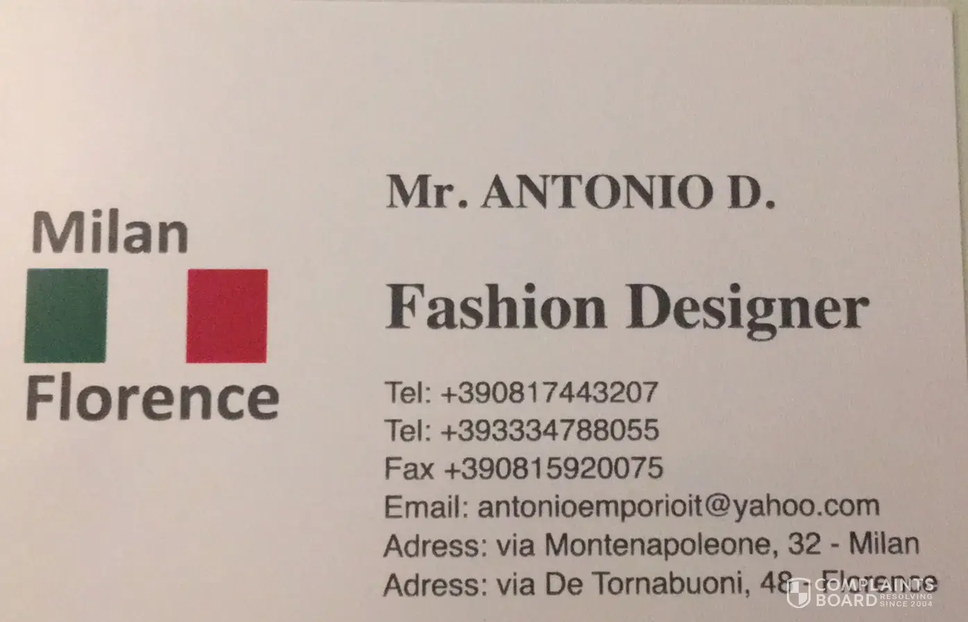 Sorry, for some reason the pic of his card isnt uploading. Its got the name "Mr. Antonio Dell Algida", he claims to be a designer for Armani, email is "antoniodellalgida@emporioarmani.com". Address "VIA. MONTE, NAPOLEONE. 10, MILANO" Mobile "+[protected]" Fax " +[protected]"