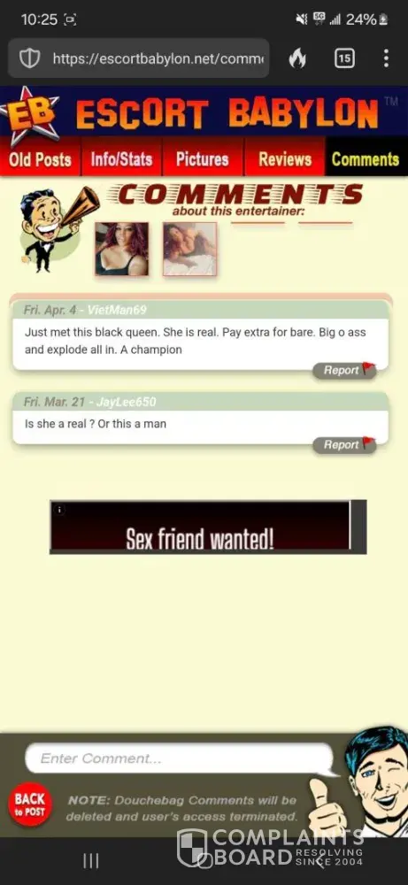 Hello I'm Nicole James and I need some immediate attention to the website escort babylon it has me advertising my ad on back page as an escort and that is so far from the truth i went to Georgia Massage School and im am raising the rest of my funds to complete all my paper work in order to obtain my building permit..please delete all info about me from this site...this is ruining my reputation.