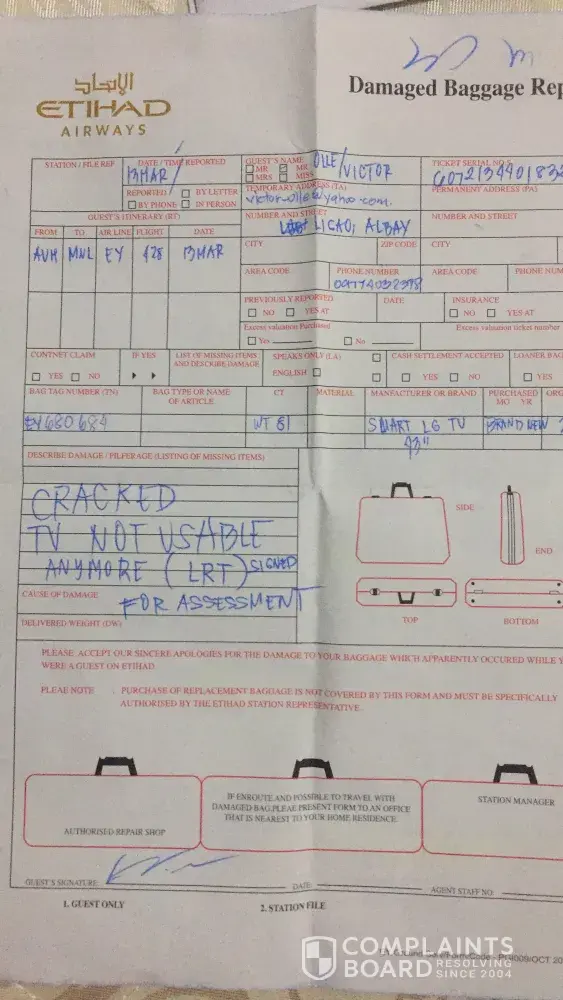 I early check in my baggage at Abu Dhabi City Terminal on the 13 Mar18, but when i arrived in the Philippines My television set was broken when i get from the belt in the Philippines, i complain in naia etihad airways staff and they make a Baggage Damaged Report which is attached,